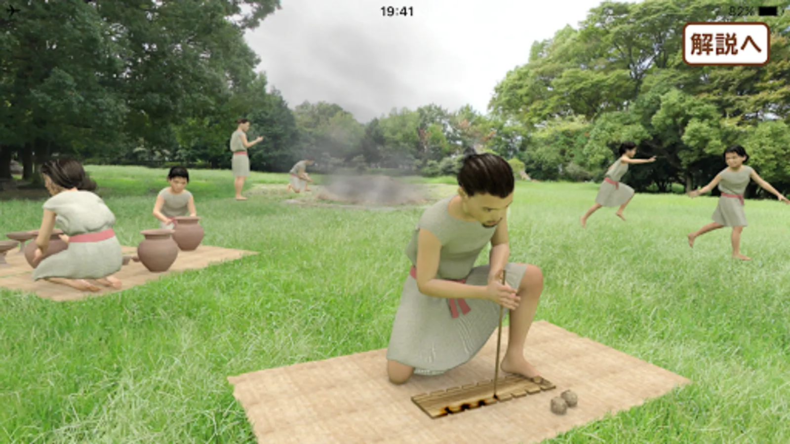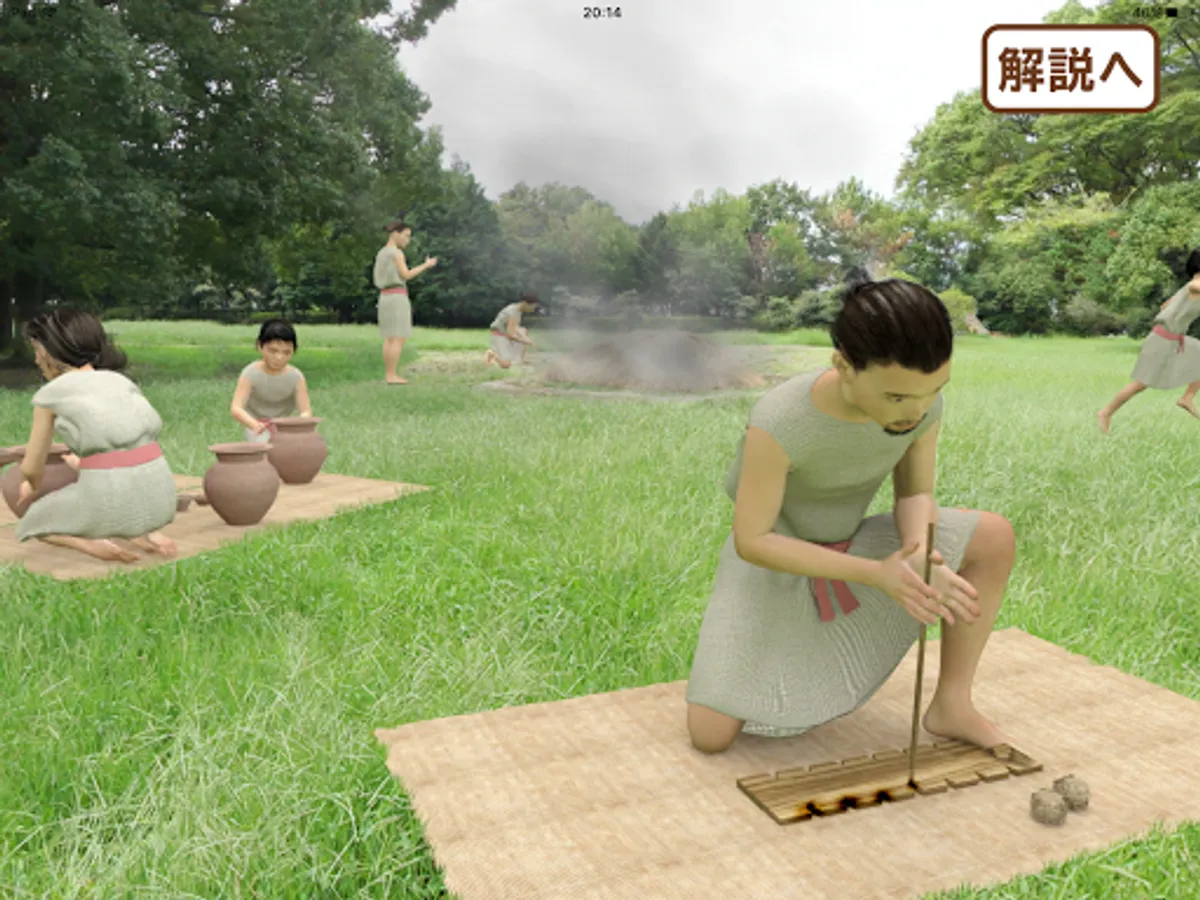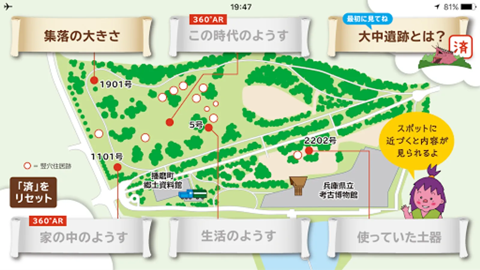 大中遺跡ARは、兵庫県加古郡播磨町にある大中遺跡(国指定史跡)で、古代住居跡を中心に、CGで再現された古代の生活風景をはじめ、集落の規模や竪穴住居、使っていた土器などの解説を見ることができるアプリです。
