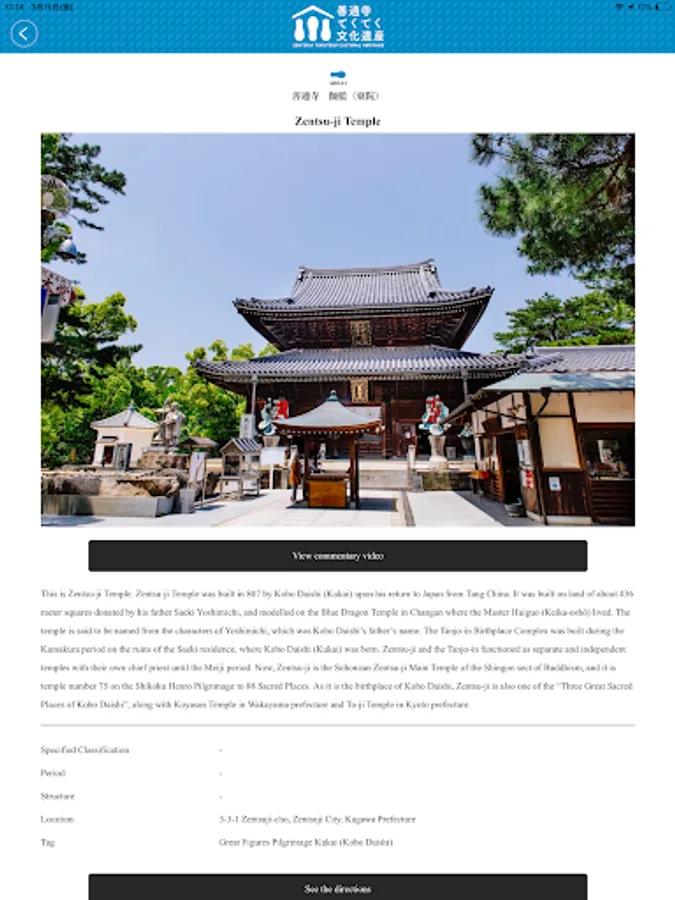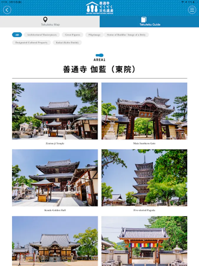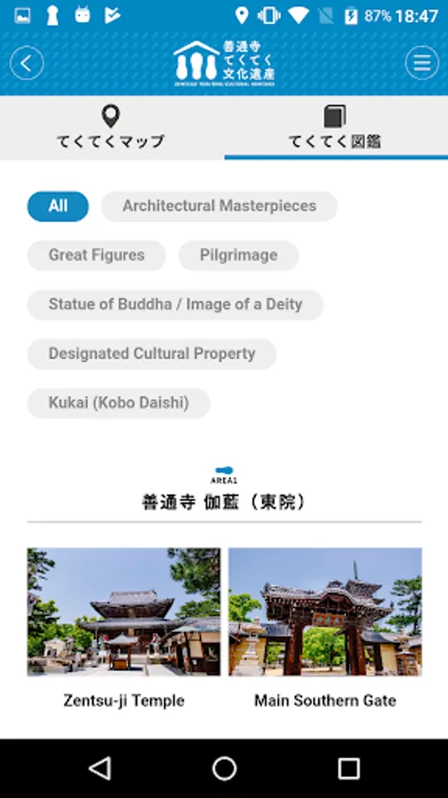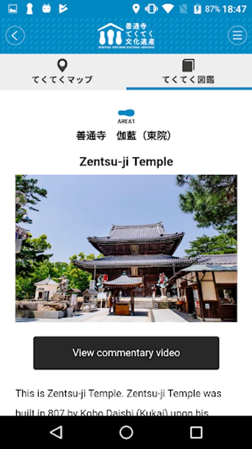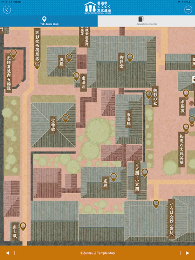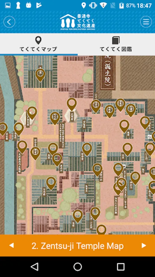 This application uses a map and illustrated guide to assist you in enjoying learning about the cultural heritage of Zentsuji City.