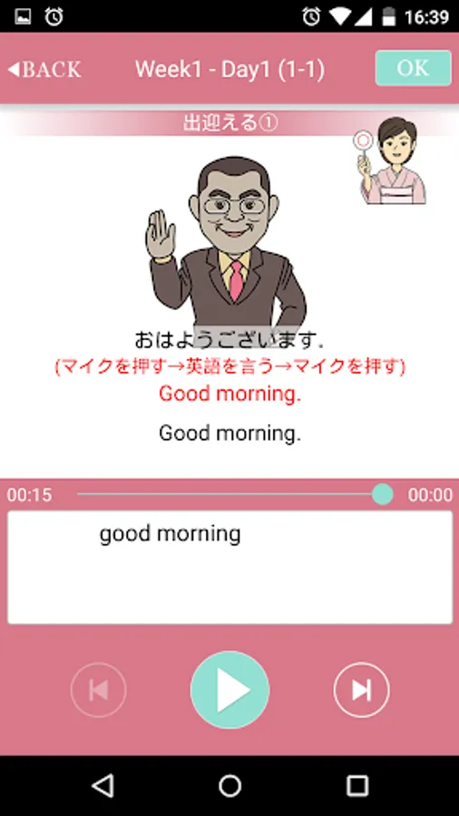 ・通信講座のテキストと同じ英文が言えたと判定されると右上にOKマークが表示されます。