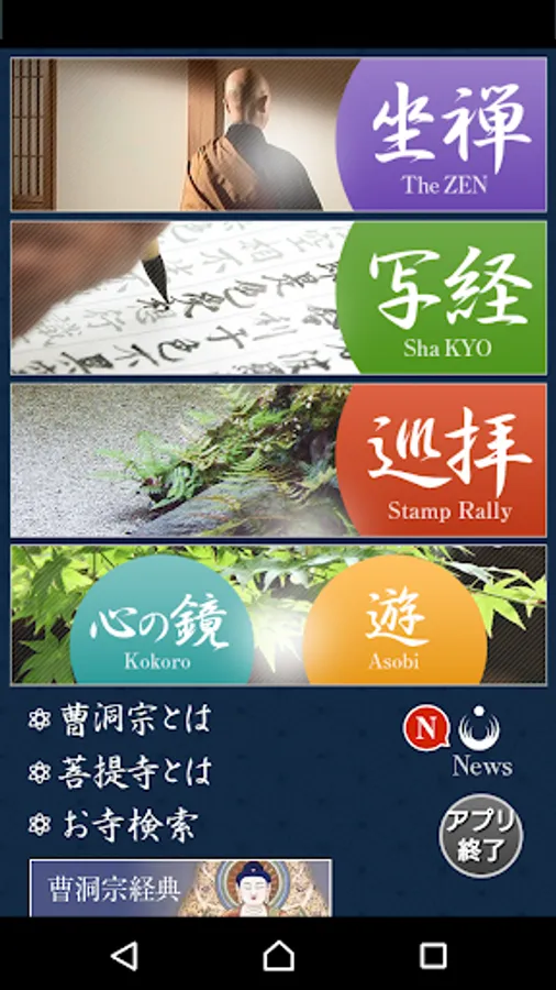 このアプリは『坐禅』『写経』コンテンツをはじめ、木魚や警策、鐘の音で遊べる『遊』、1日1回祖師方のお言葉が読める『心の鏡』など、充実の4コンテンツで構成された全コンテンツ無料のアプリです。