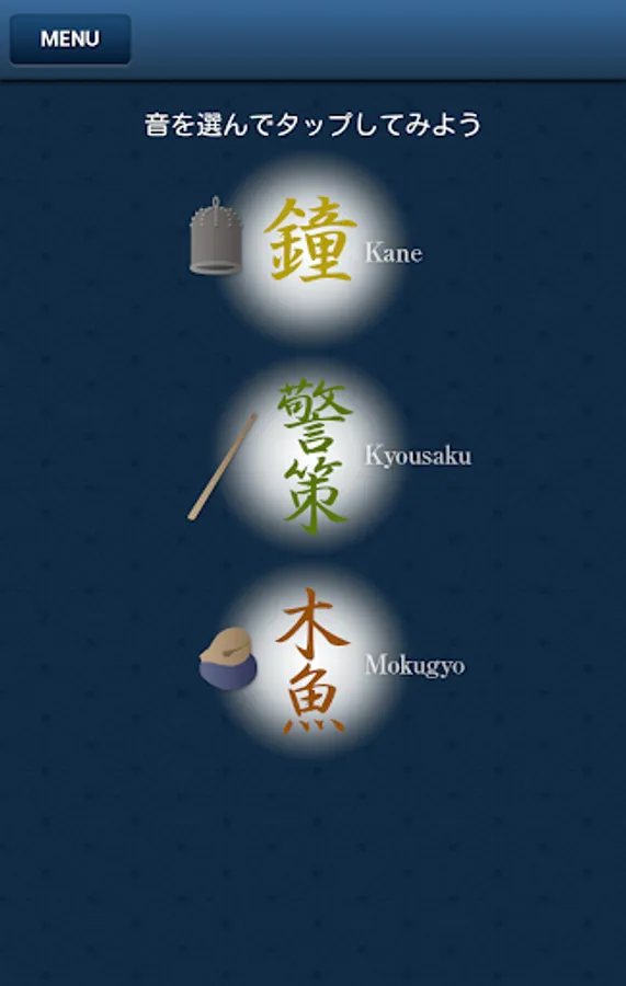 ・鐘/警策/木魚の3つの音の中からひとつをお選びいただき、画面をタップすると音が鳴ります。