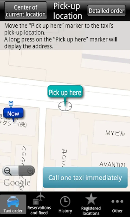 2. On the [Taxi order] screen, press the [Zoom in and specify the location] button, and move the [Pick up here] marker to the pick-up location for the taxi.