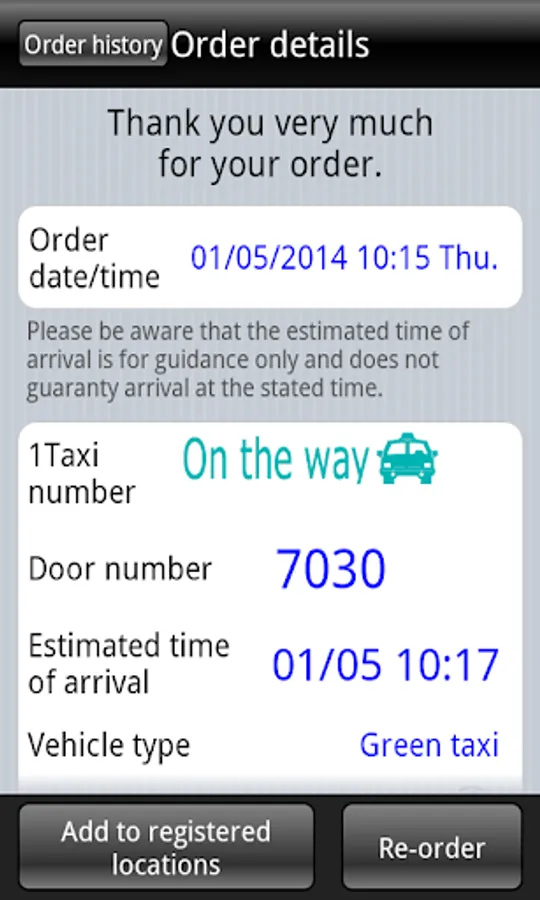 5. When the taxi has been arranged, you will be informed of its radio number and estimated time of arrival. This completes the order.