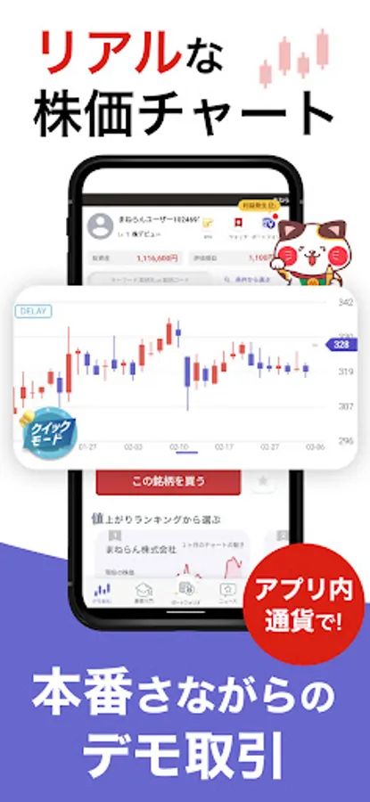 Use in-app currency to experience stock investment demo trading based on real stock charts.