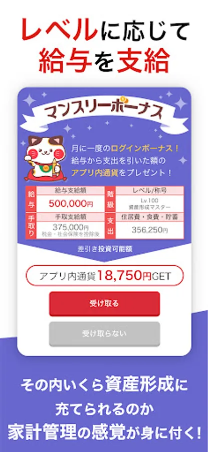 Salary is paid monthly according to the level. In addition, a part of it will be presented as in-app currency as funds for asset formation (*).