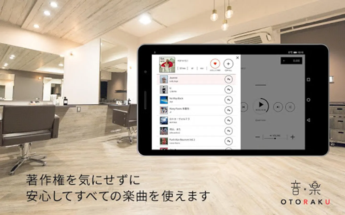 "OTORAKU -Sound / Raku-" can be easily used if you have a mobile terminal and a Wi-Fi environment. The domestic and foreign music labels that can be used are the largest commercial BGM apps in Japan. You can create a playlist that matches the store concept by yourself using the distributed music, so you can express your particular space.