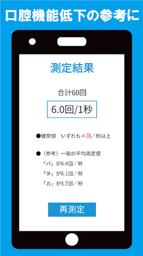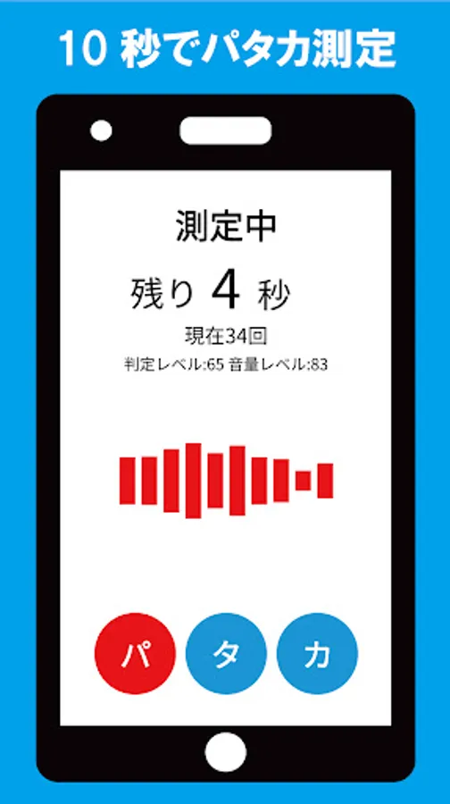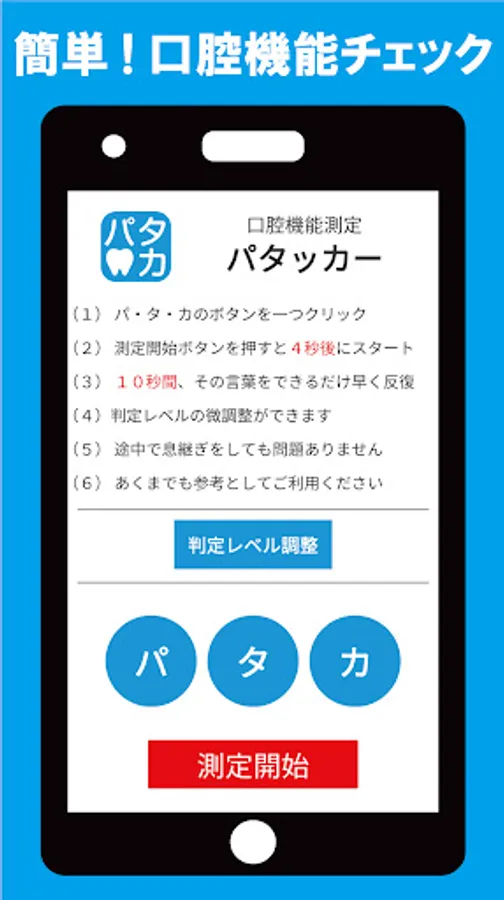 How many times can you say "pa", "ta", and "ka" in 10 seconds? Easy and automatic measurement with a smartphone! "Physical health starts with your mouth." Oral Diad Cokinesis App.