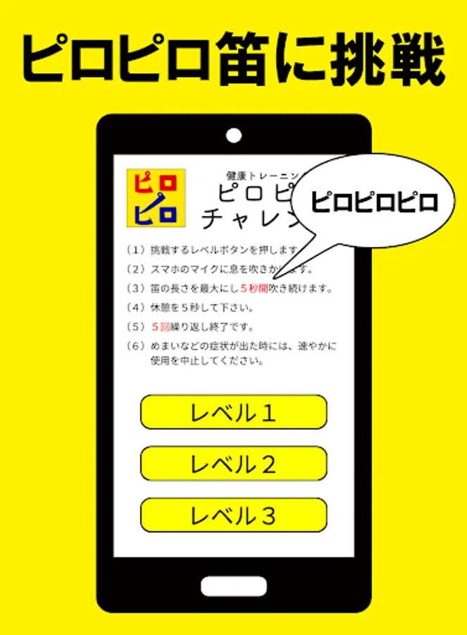 "Piro Piro Challenge" is an Android free app that allows you to easily perform breathing training and oral function training. This name is given because the motif is "Piro Piro Flute". Why "Piro Piro Whistle" for breathing training and oral function training? Many people may wonder. However, recently, it has been found that this whistle is effective for dieting and rehabilitation, and it is being used in the field of long-term care.