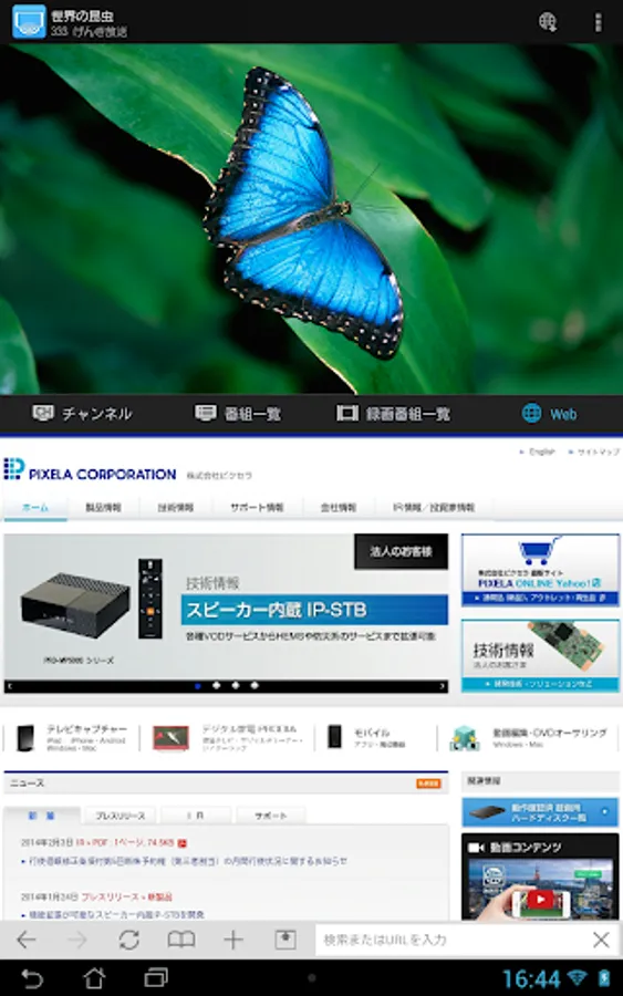 This application is made Pixela "Wireless TV tuner PIX-BR series", "wireless TV function to the personal computer corresponding" and "Smart Box Recorder Set PIX-SMB110-1T", "Recorder Unit PIX-SMB100-OP" in the TV app that supports is. You can enjoy a high-definition image of the full-segment unique wirelessly.