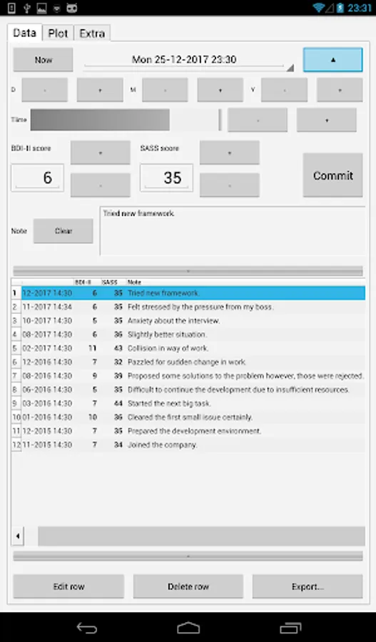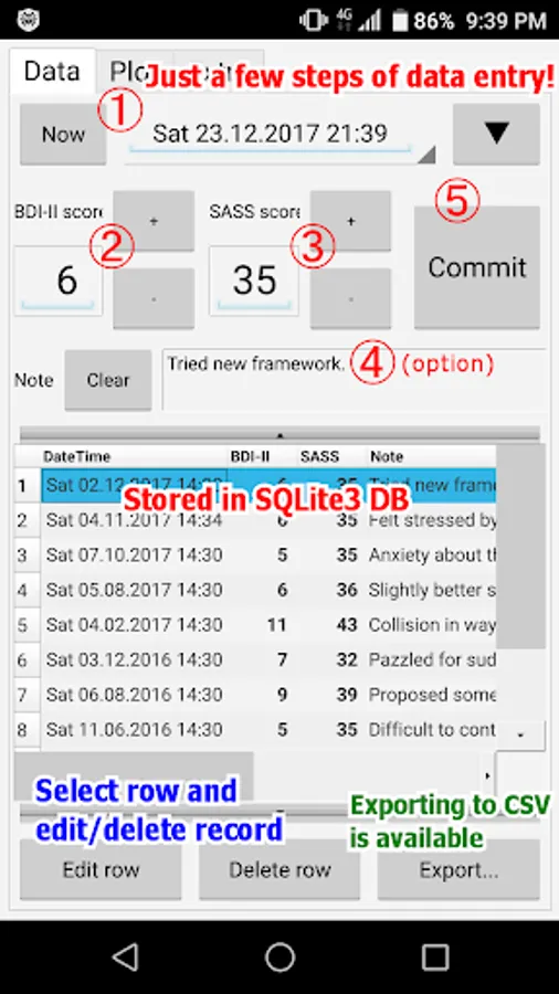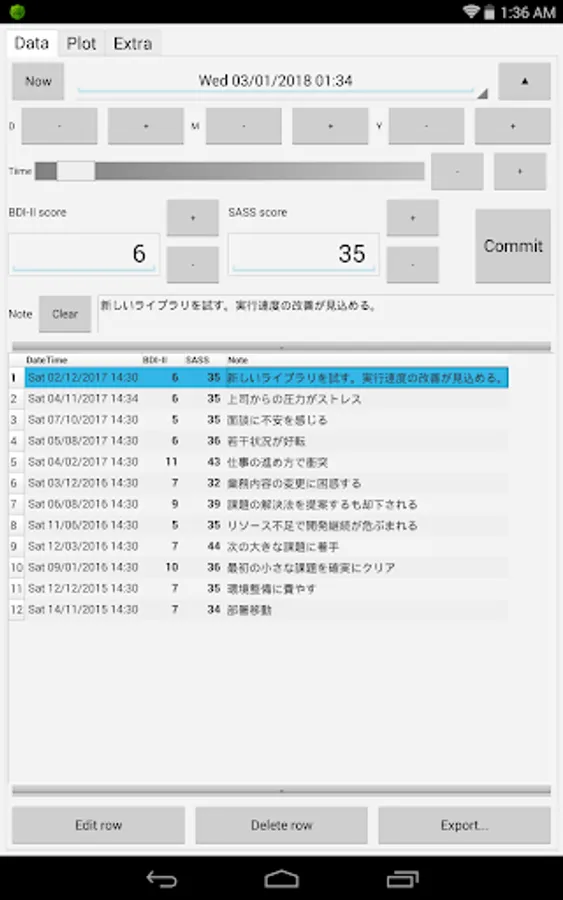 Psychological examinations such as BDI-II and SASS are effective way of grasping the mental state. Although we tend to focus on the changes in response to each question of the exam, it is important to pay attention to the transition of the scores. With this app, you can objectively grasp by recording the scores and check them in table.