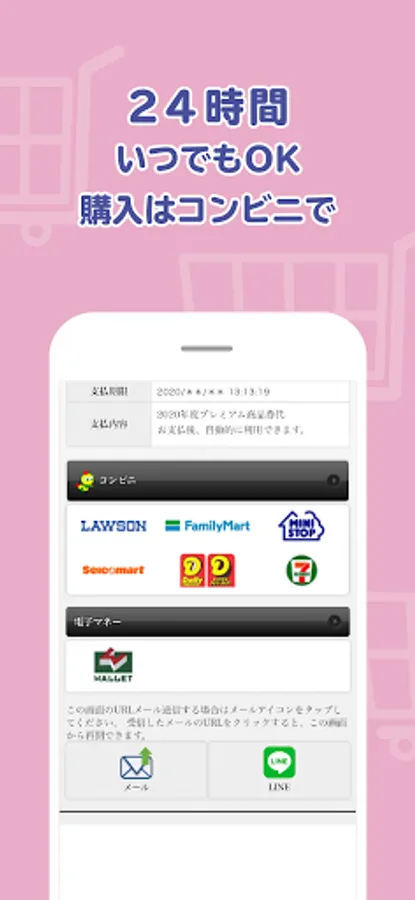 Gift certificates can be purchased at convenience stores 24 hours a day. The purchased gift certificate will be charged in the app with the premium amount added.