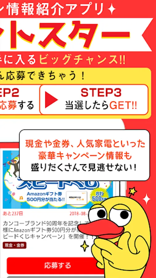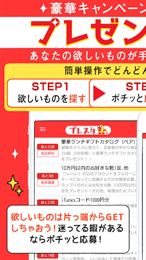 It is a summary introduction application of a wide variety of campaign information. If you're a prestige that brings together a wide range of genres, such as cash, cash vouchers, luxury food and branded clothes, home appliances and cars, you will surely find what you wanted! Presta is easy and easy to find out when you want to know. Since the flow up to the application is very easy, it is attractive that you can apply for many campaigns. Let's start a good life from today using Presta!
