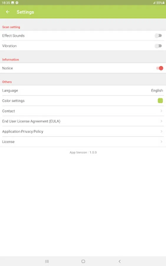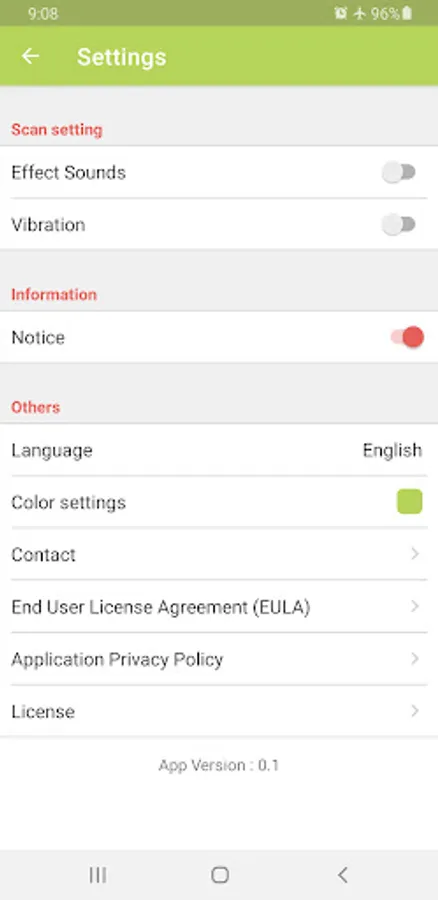 QR/barcode scan from camera, QR/barcode scan from images, QR/barcode scan result sharing, app color and theme selection/change, select/change the app language setting (languages available: Japanese, English, Chinese (simplified), Korean, Thai, Vietnamese, German, Spanish, French, Arabic, Russian and Hindi)