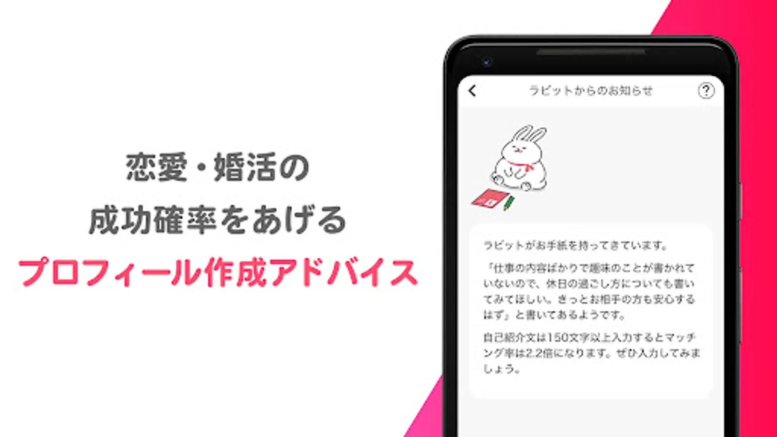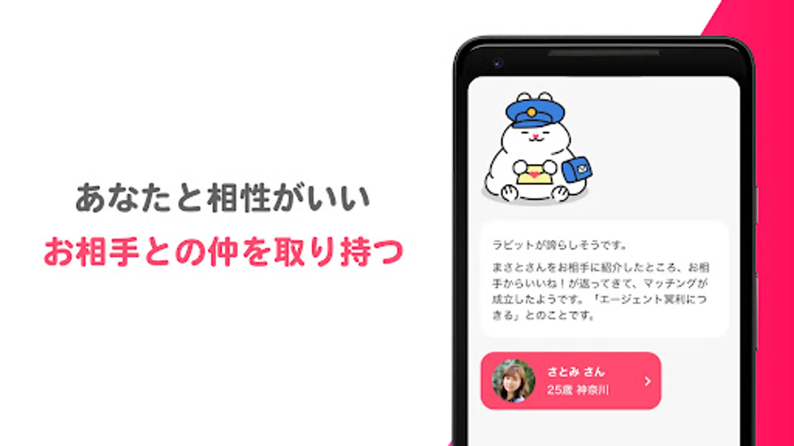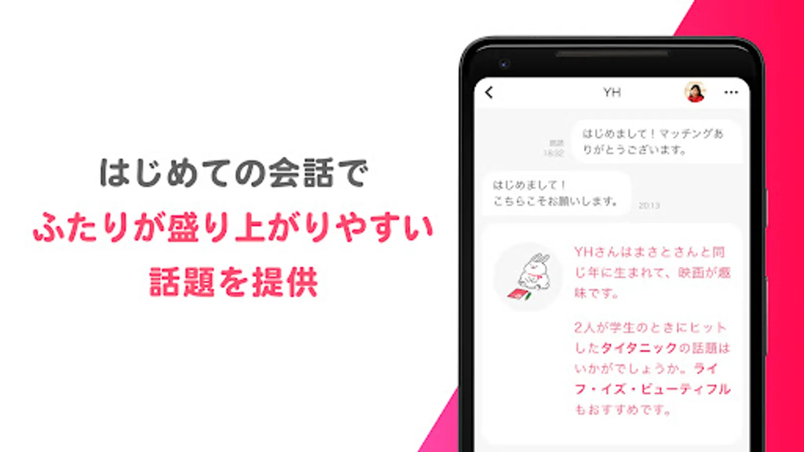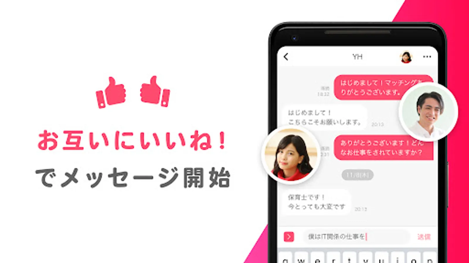 "Those who are looking for a boyfriend or girlfriend for the first time using a matching app" "Those who seriously want a boyfriend or girlfriend" "Those who feel that there are few encounters at work" "There are encounters, but it is quite an ideal partner This is a dating/marriage-hunting app recommended for those who can't meet people, and those who don't like conversation at first meetings, such as joint parties, street parties, and parties.