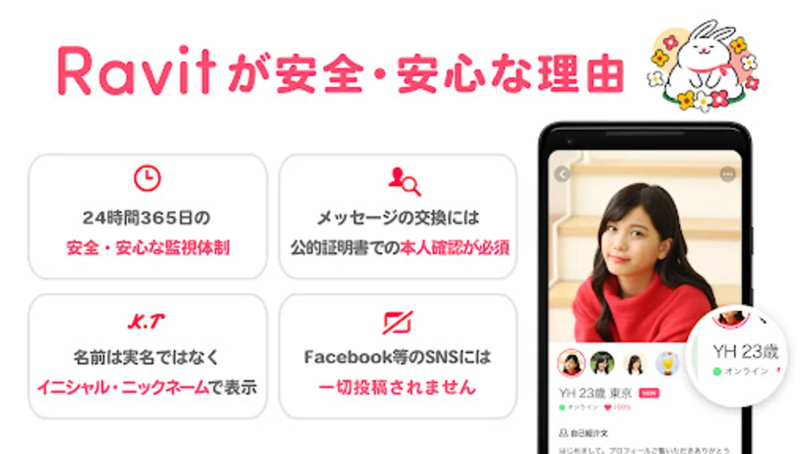 As a dating, love-hunting, and marriage-hunting matching app service, we have created an environment where you can find a partner safely and securely by verifying your identity with a driver's license, etc., and eliminating unauthorized users through a 24-hour, 365-day monitoring system.