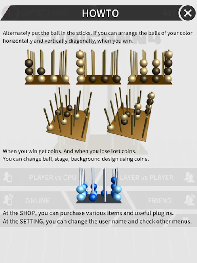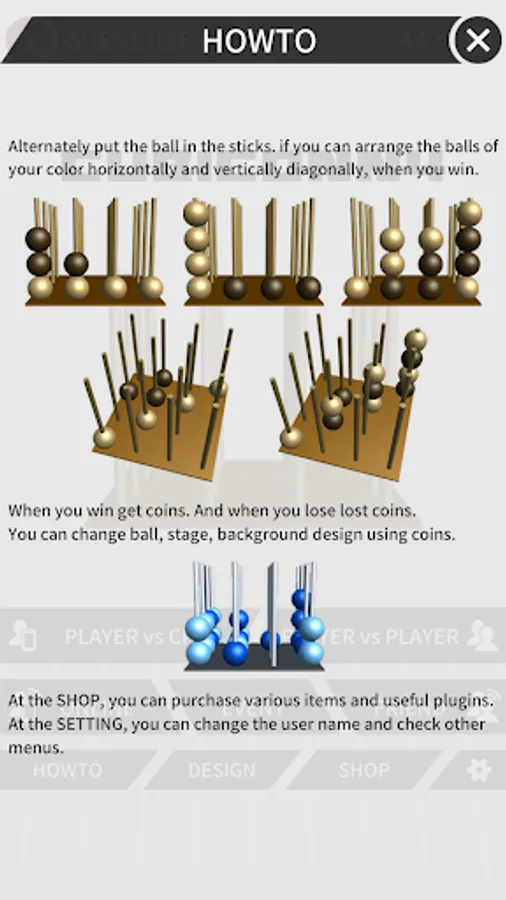 Alternately put the ball in the sticks. if you can arrange the balls of your color horizontally and vertically diagonally, when you win.