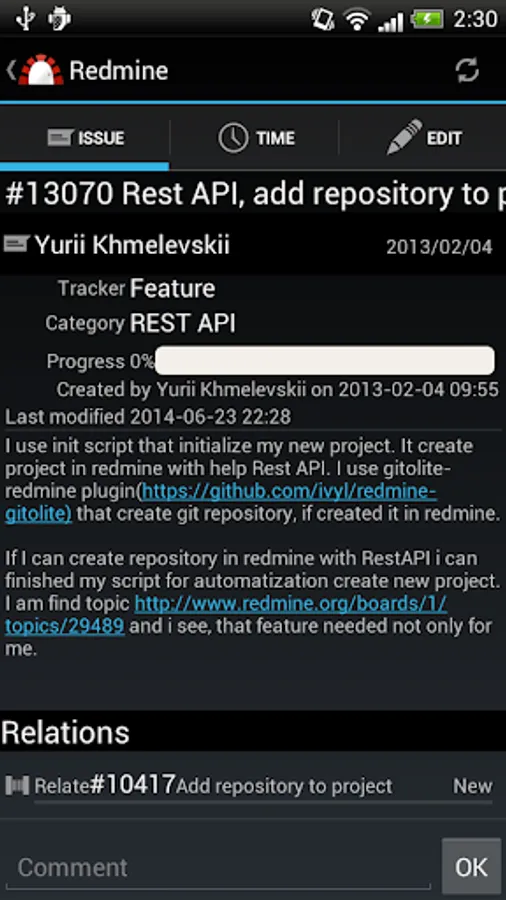 * Create or modify issue/timeentry