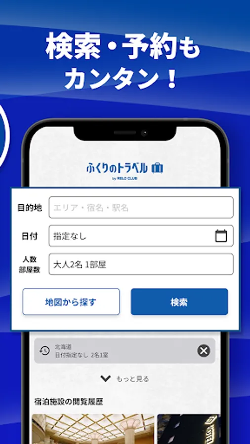 With the member-only app "Fukuri no Travel", you can easily search for and make reservations for advantageous plans for over 20,000 inns nationwide. Not only the members themselves but also their families can use it! Please make full use of the member benefits with this application.