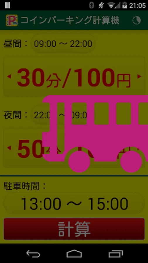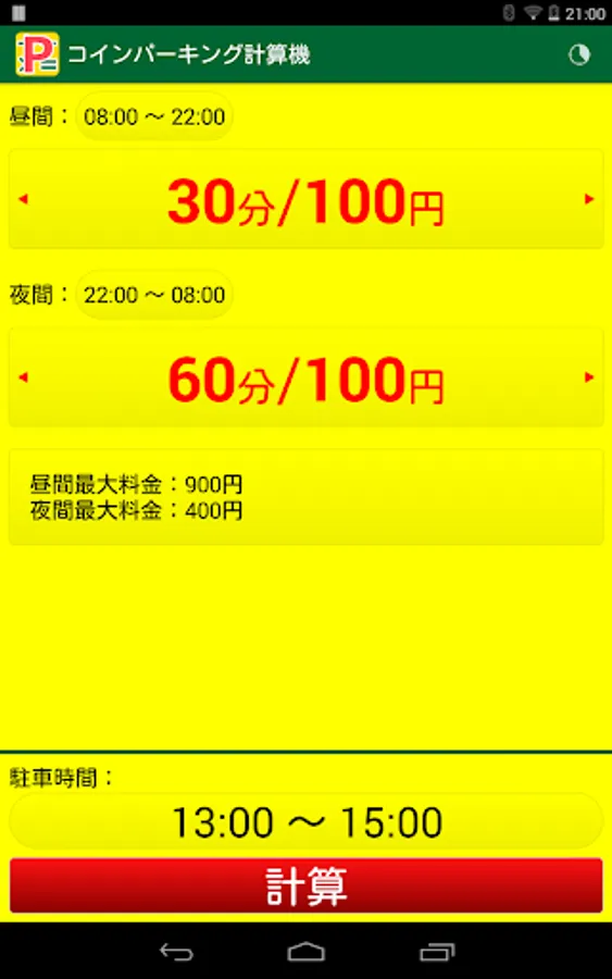 1. Enter "Daytime rate" and "Nighttime rate" written on the signboard of the coin parking lot