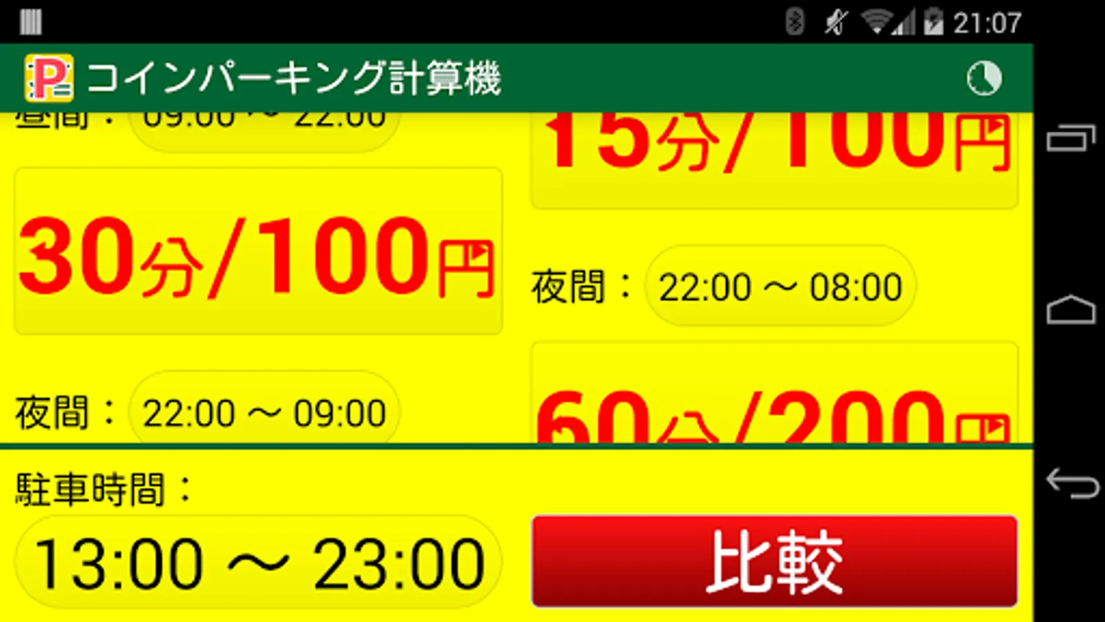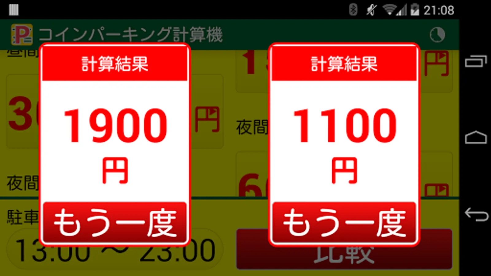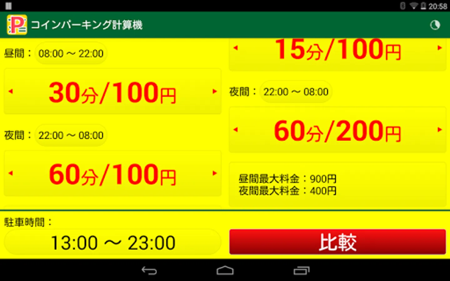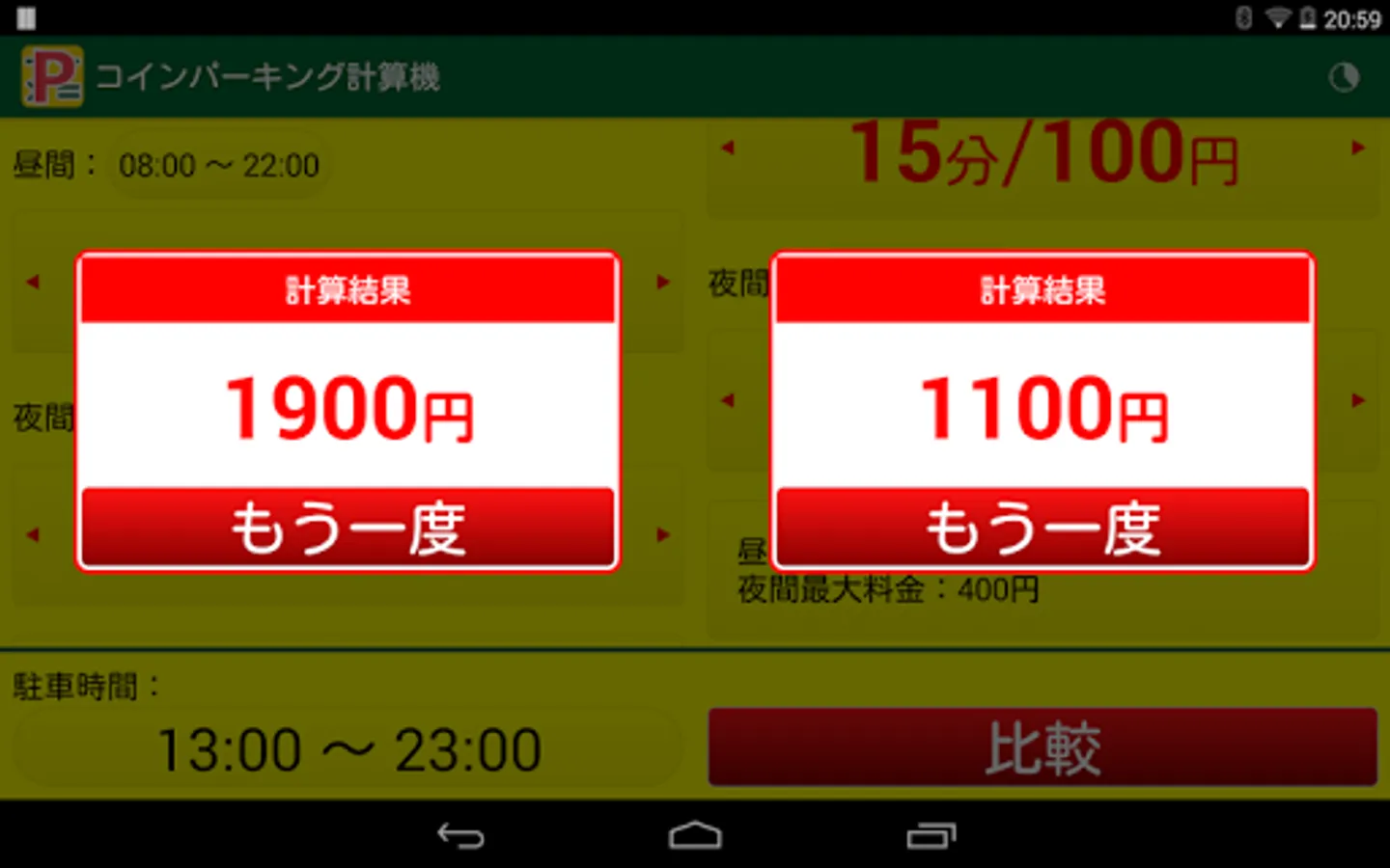 ・On the horizontal screen, you can enter information about two parking lots and compare prices.