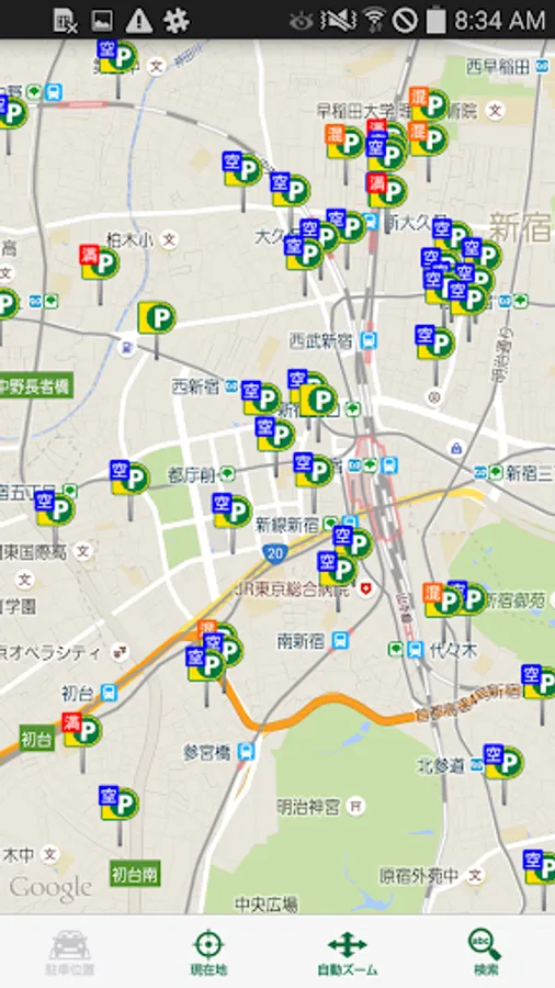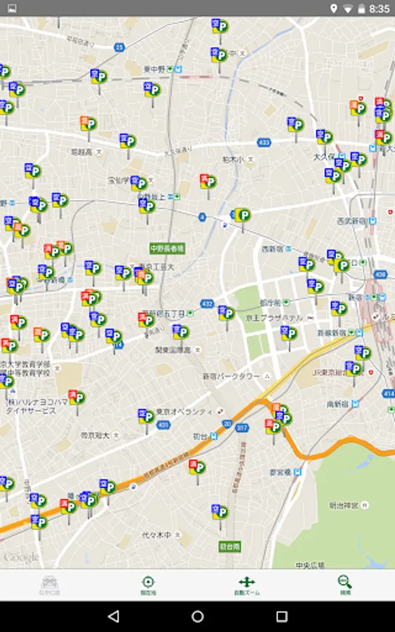 Pins indicating parking lots are marked with “vacant”, “congested”, and “full”. You can see at a glance whether the target parking lot is empty or not.