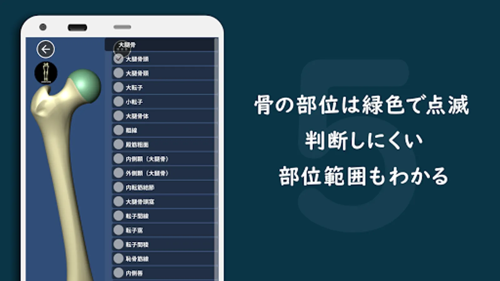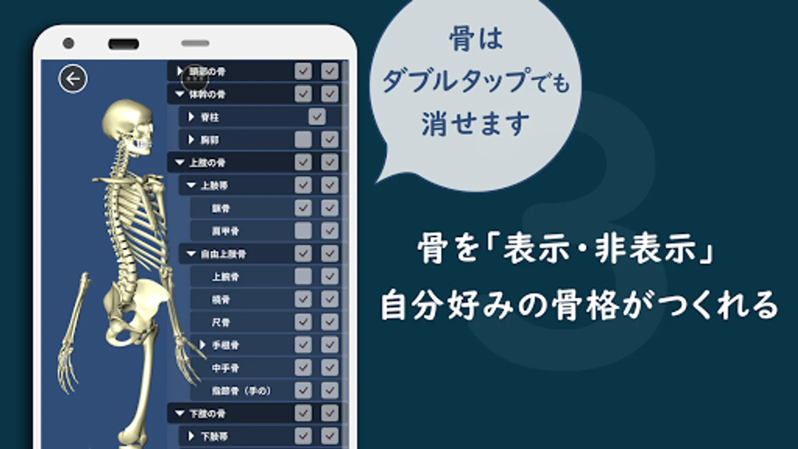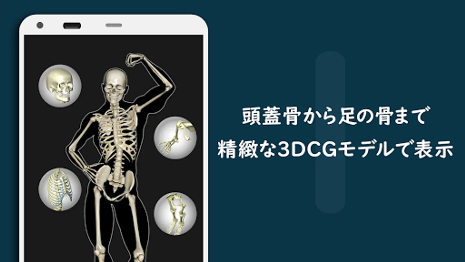 前頭骨から環椎、鎖骨、足の指節骨まで、各骨の部位名称を収録。解剖学的に精緻なCGモデルで部位を立体的に特定できます。