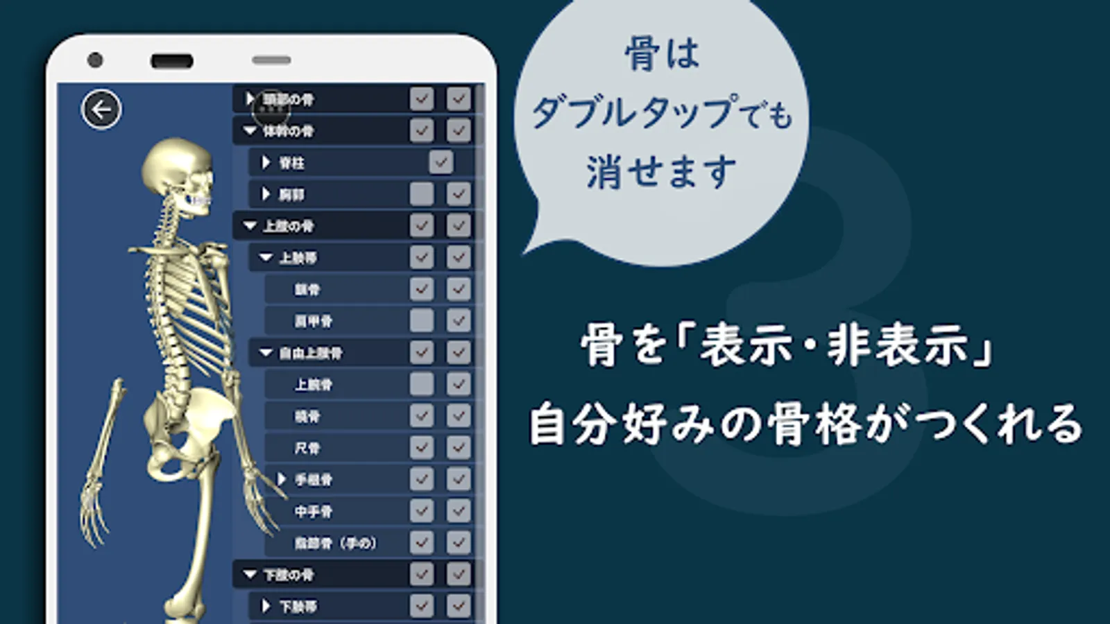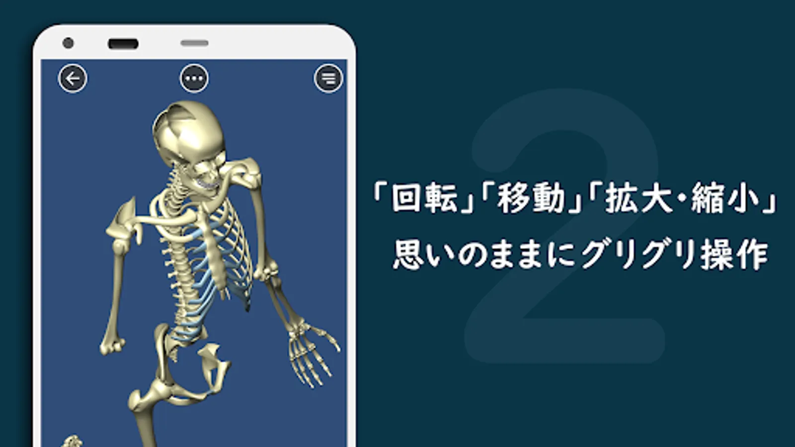 Rotate, scale, and move in 3D as you like. You can observe the bones and bone parts in three dimensions.