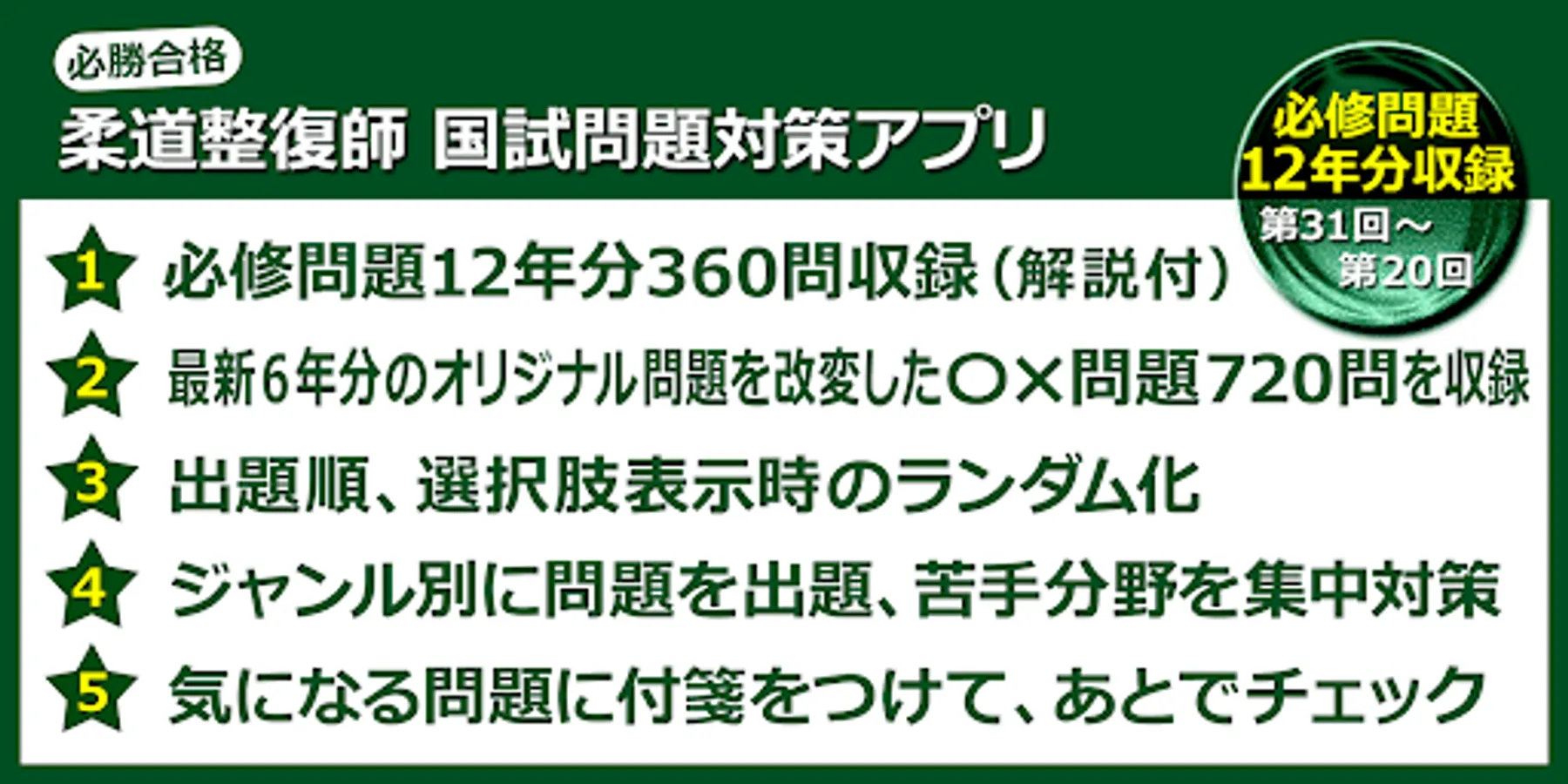 In addition to the 4-choice questions for 12 years, the latest 6-year 4-choice questions have been modified into 1 question and 1 answer ○ × questions, and are included in this application for national examinations for Judo therapists.