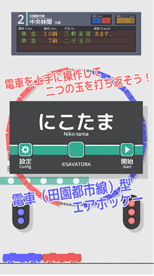 A circular air hockey with the motif of a train (Denen-toshi Line).