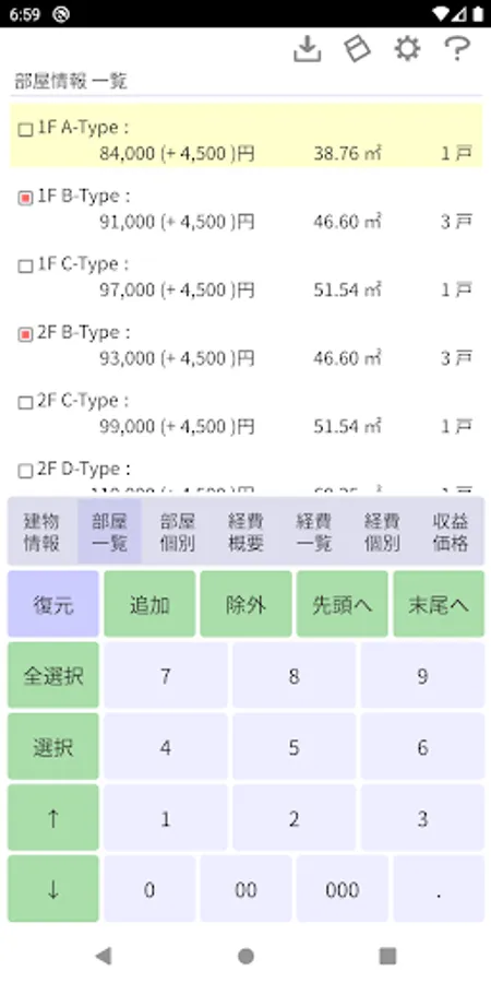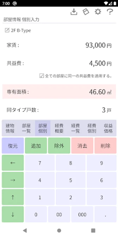 ・ The total income and total area of the apartment will be calculated from the room information. You can enter the rent, common area fee, and private area of the property in units of rooms. You can also estimate the total floor area of an apartment by using the rentable ratio from the total occupied area.