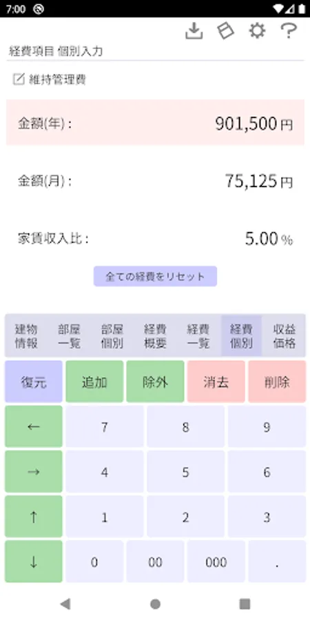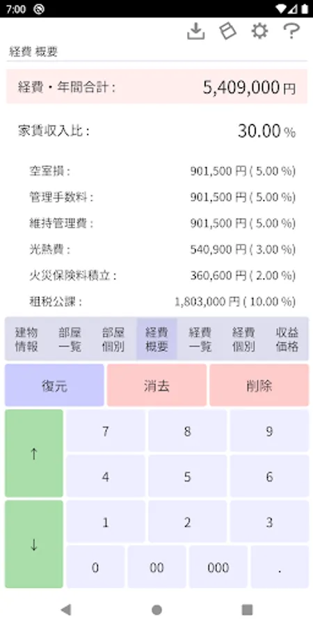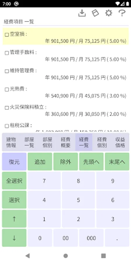 ・ Estimate the expense amount from the income of the apartment. The amount is calculated from the ratio set for each expense item. It is also possible to specify a fixed amount by directly entering the amount.