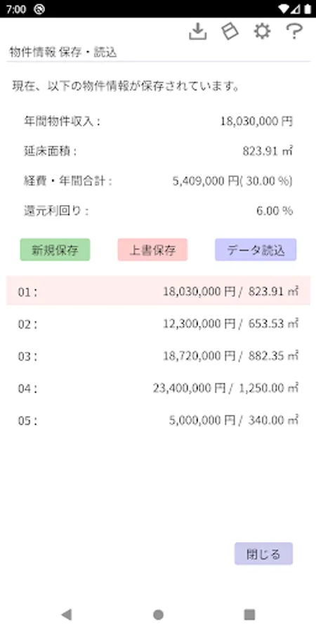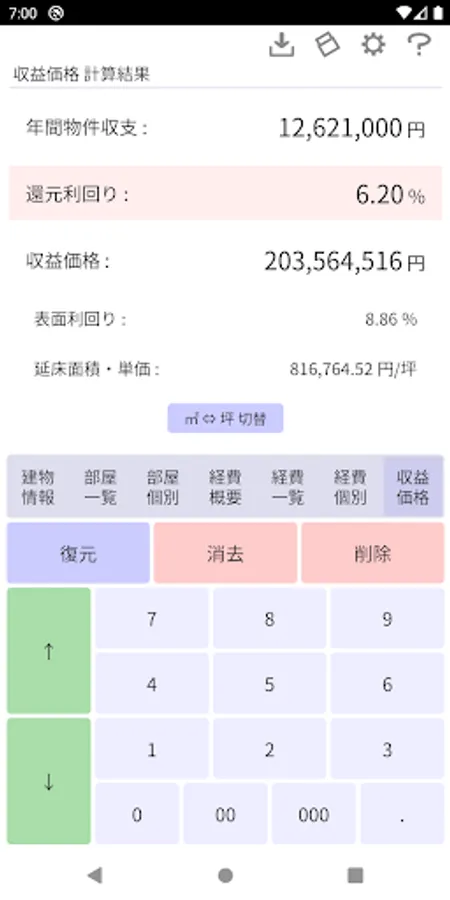 "Apartment profit price calculator" is an application that calculates the profit price that is a measure of the real estate value of the property by using the profit return method (direct return method) from the rent of rental real estate such as apartments and condominiums.