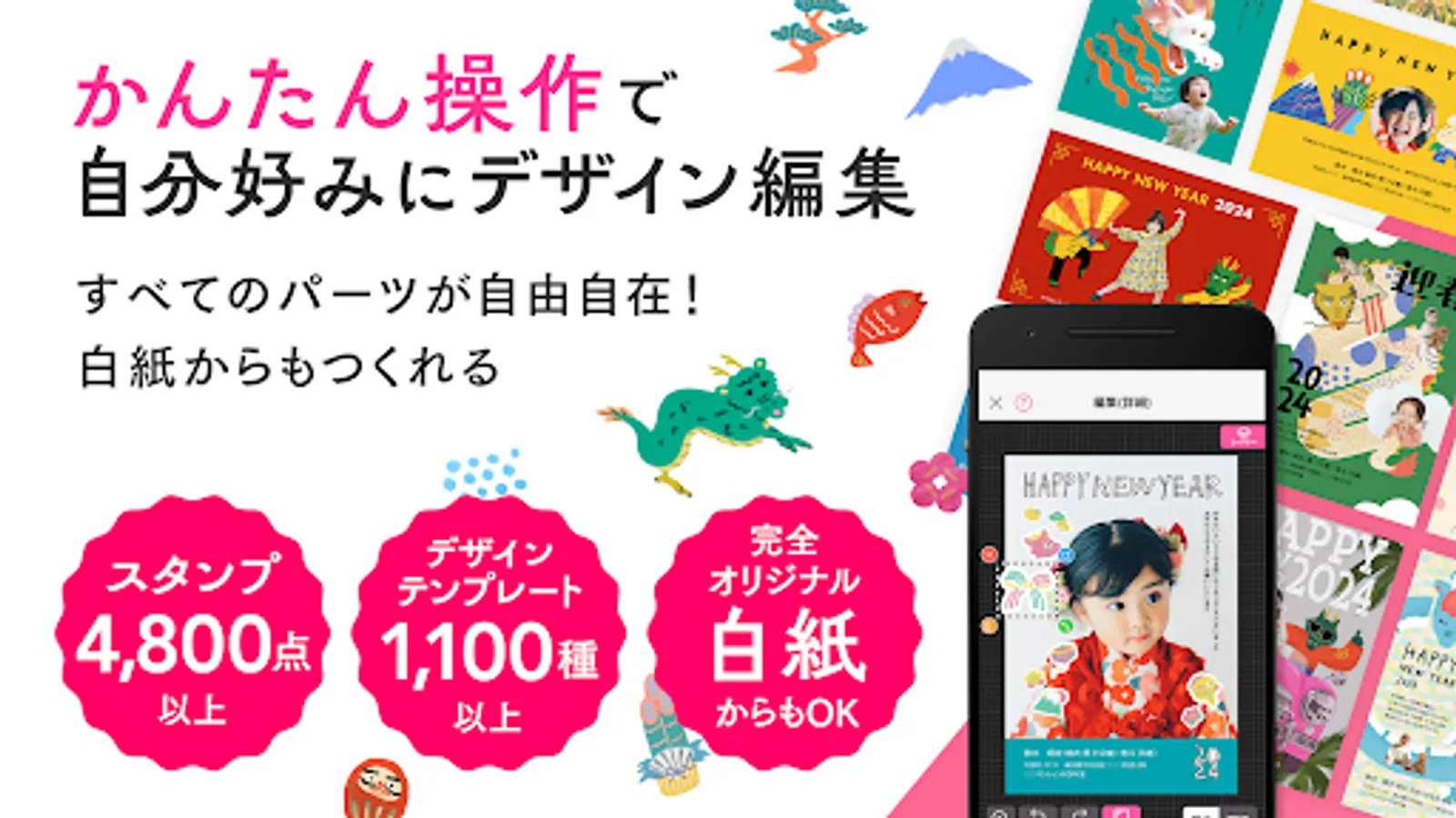 With both easy operation and high functionality, you can edit the design as you wish, and enjoy creating original New Year's cards from blank paper for free.