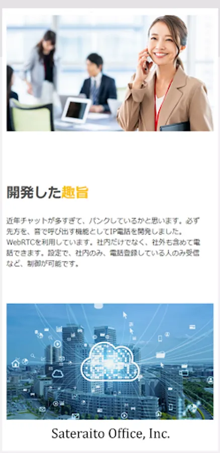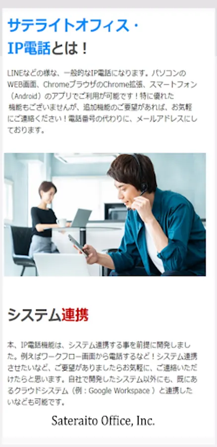 It is an IP phone application. It can be used on the web screen of a computer, the Chrome extension of the Chrome browser, and the app on a smartphone. You can call by specifying an email address instead of a phone number. In addition, it is possible to receive visitor notifications by voice in cooperation with "Satellite Office/Visitor Management/Reception Management Function for Cloud".