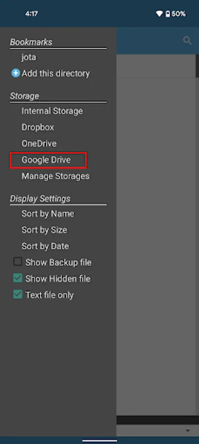 Install this plugin then you can activate the connectivity to Drive of Jota+.