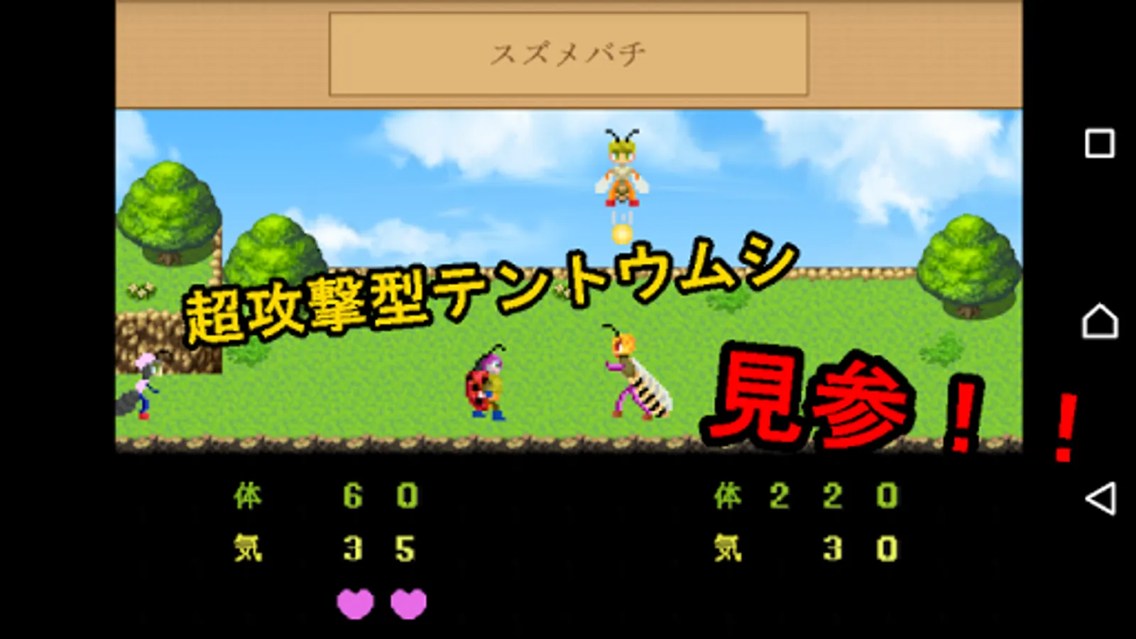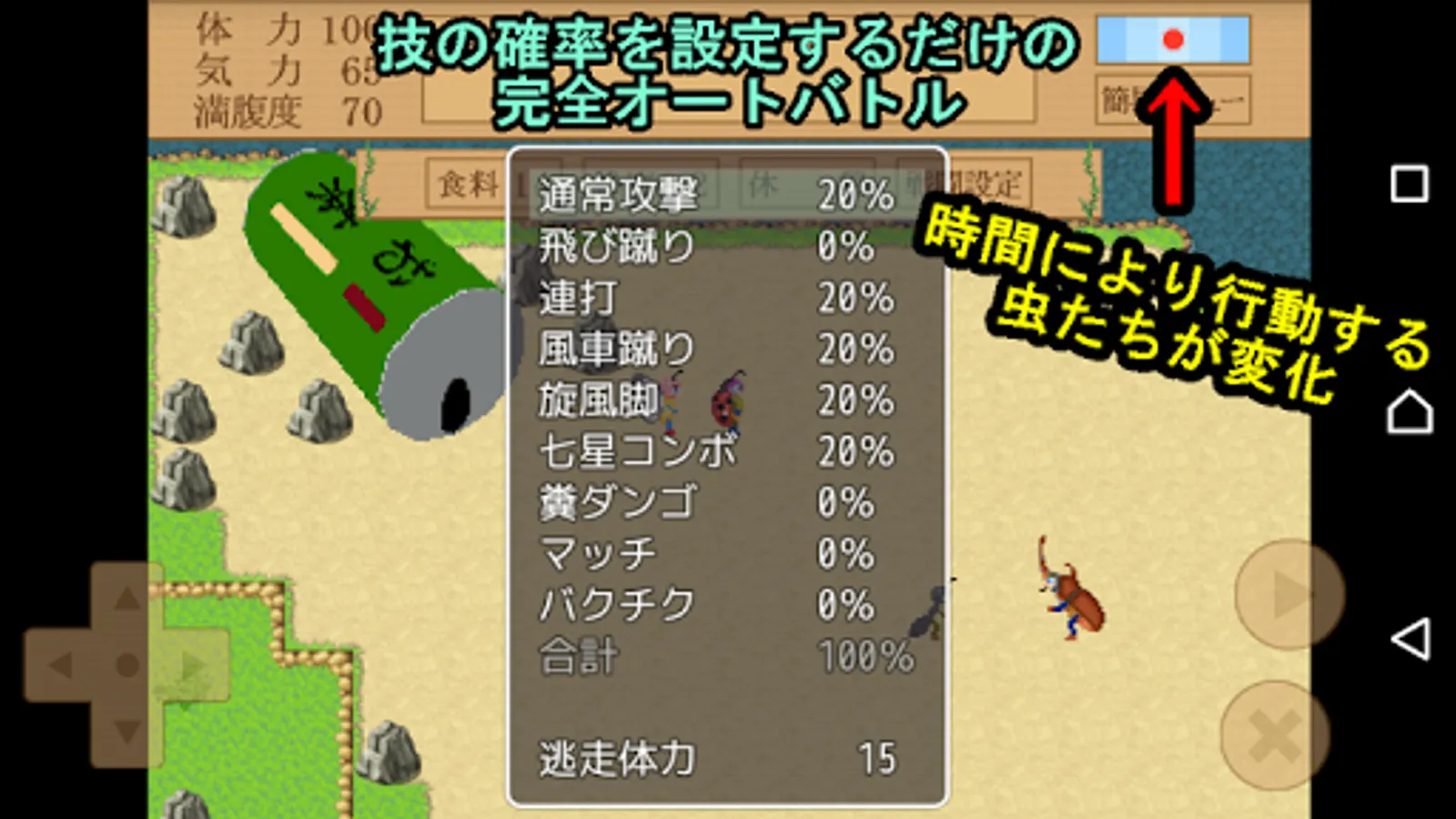 Combat is easy auto battle just to set the probability of the technique to use.During battle please cheer for bugs to fight!