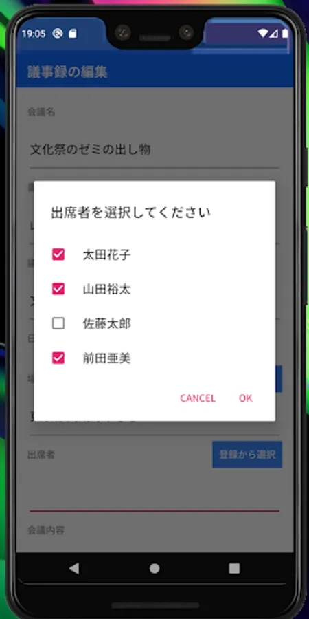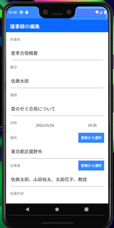 ・ If you select the meeting place or attendees registered (below) on the minutes creation screen, they will be automatically entered in the input field.