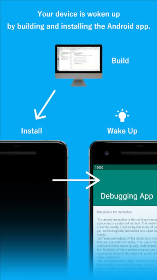 The Wake On Debug automatically wakes up an Android device when debugging an Android app (that means when installing it).