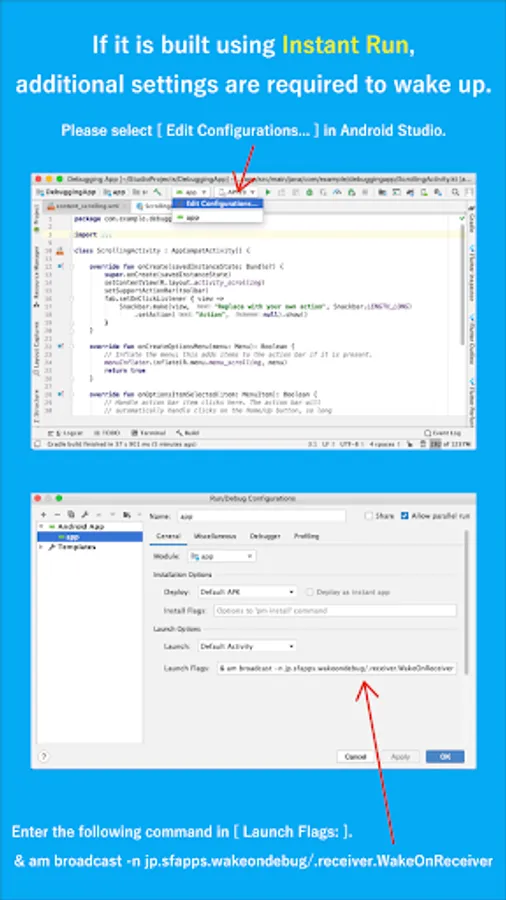 * Anytime Run: Run even when the device is awake. Please enable it when you want to be notified by notification sound and vibration when debugging even when the device is awake.