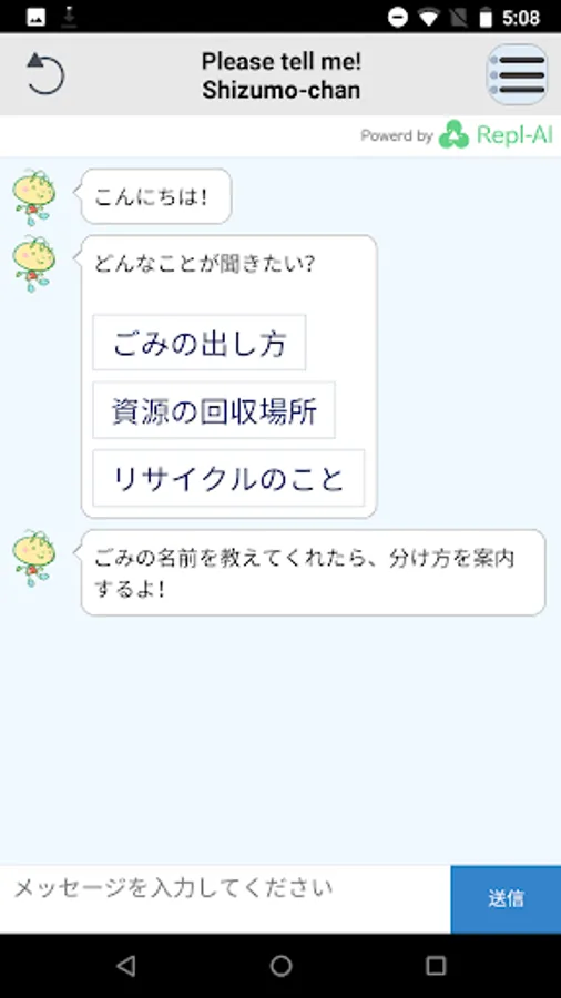 You can ask questions about garbage and recycling, in dialogue style. Let's talk to "Shizumo-chan", Shizuoka City's character to promote waste reduction!