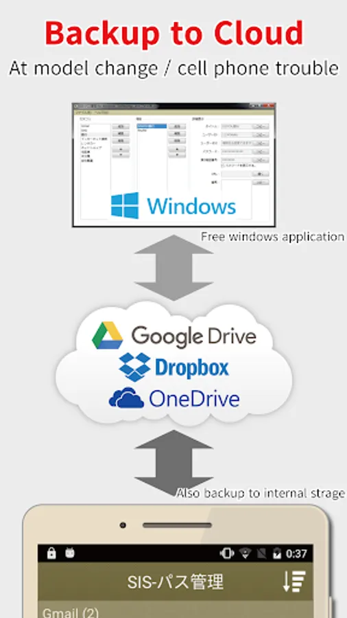 * Cloud backup. w/ Google Drive, w/ Dropbox, w/ OneDrive.