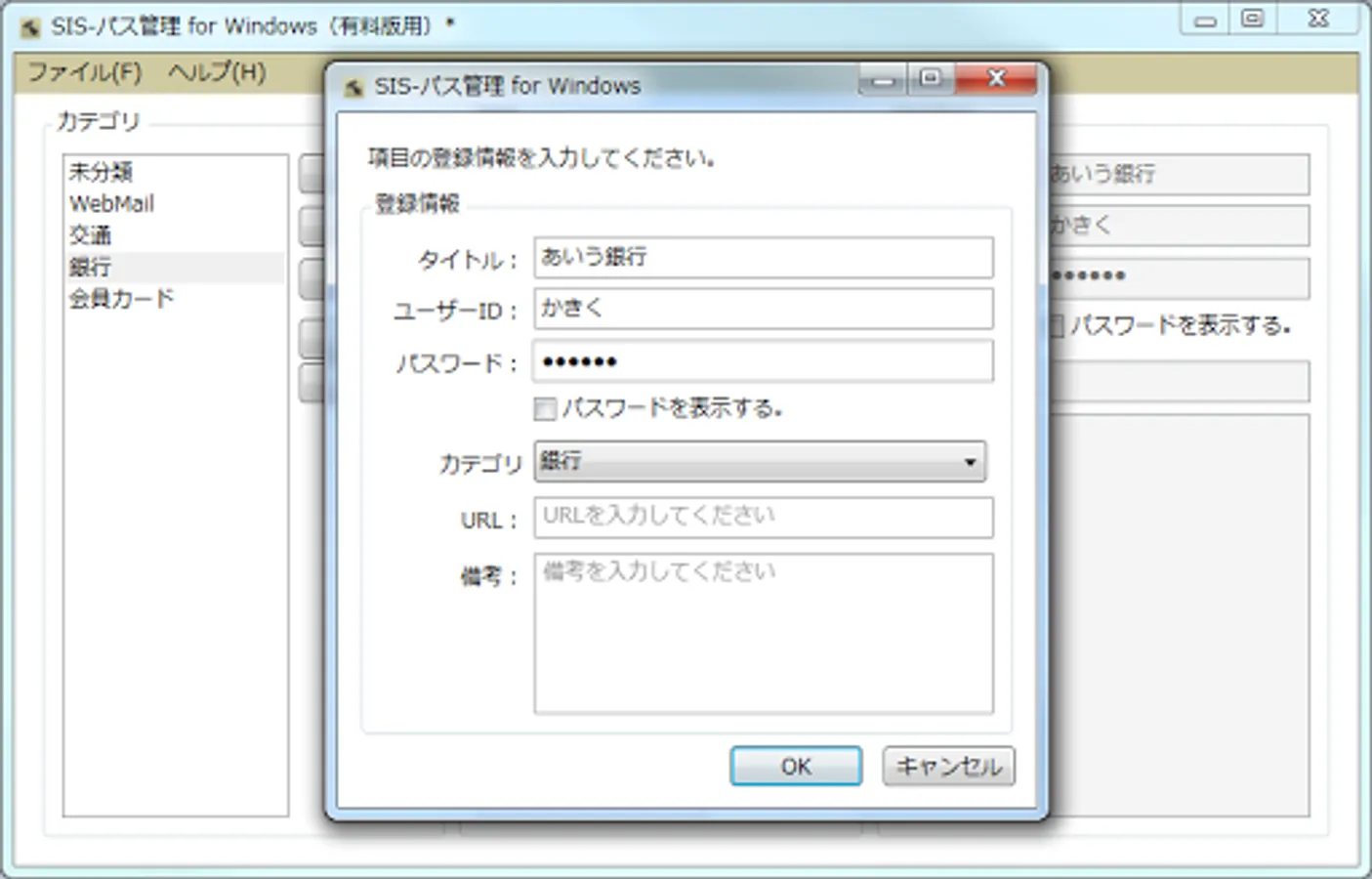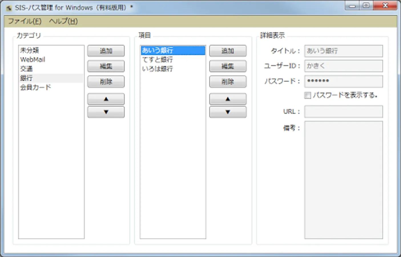 "SIS Password Manager for Windows" is PC application for Windows. This application works with SISYOU.KUM's Android-Password Manager applications.