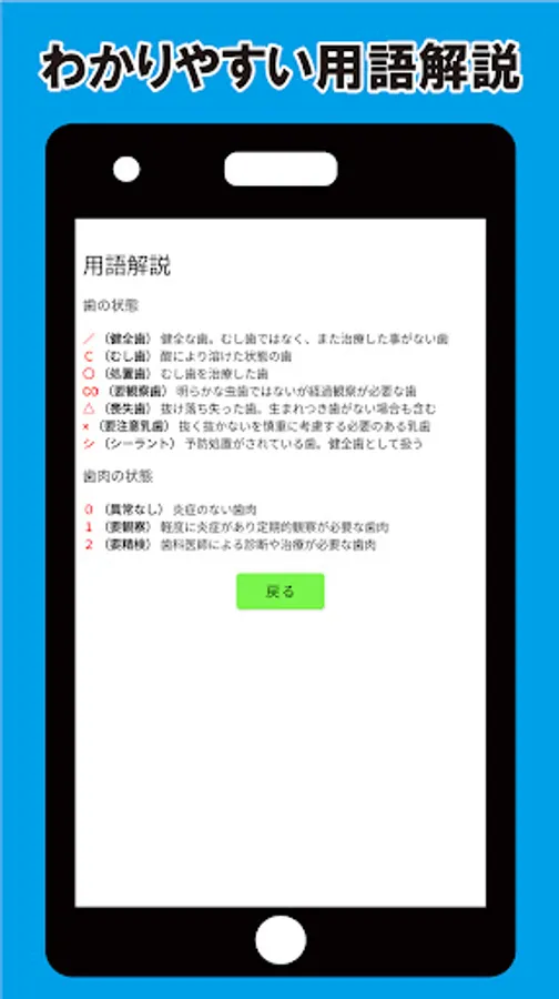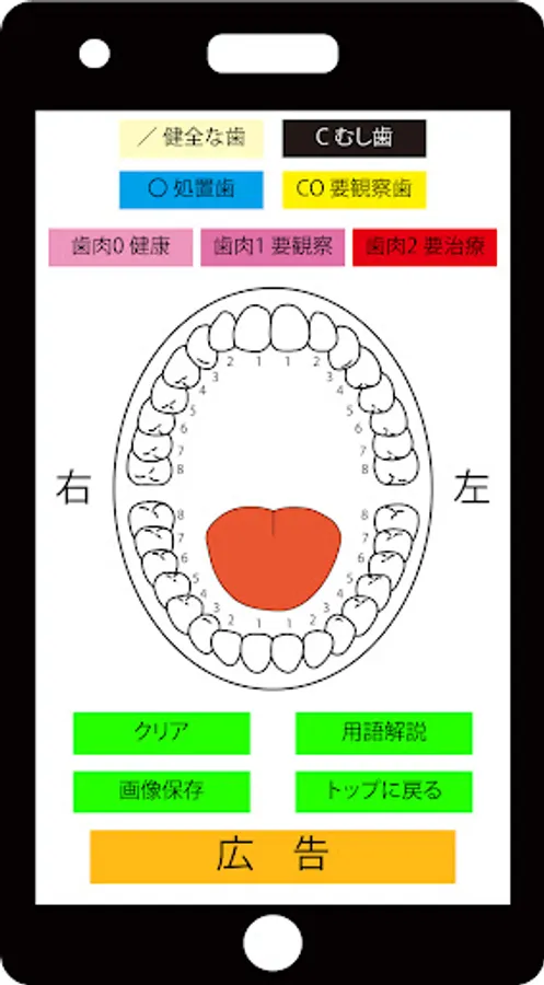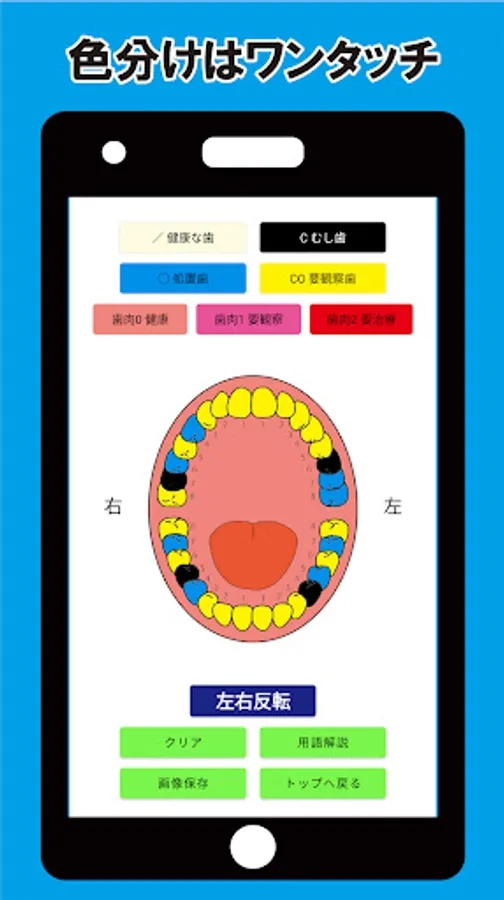 Usage is simple. Color-code your mouth based on the symbols of the dental examination results (treatment recommendation) received from school dental examinations, adult dental examinations, pregnant women's dental examinations, etc.
