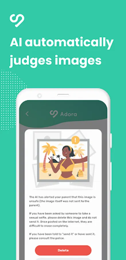 - Unsafe Selfie Detection: When a potentially obscene image is taken on your child's phone, Adora's AI detects it and sends a notification to the parent's phone (and the child will be prompted to delete the image).