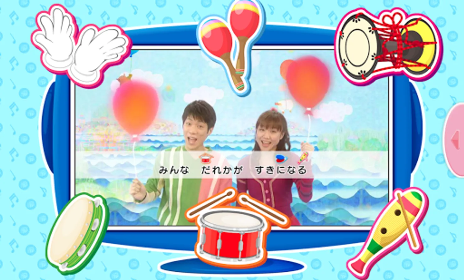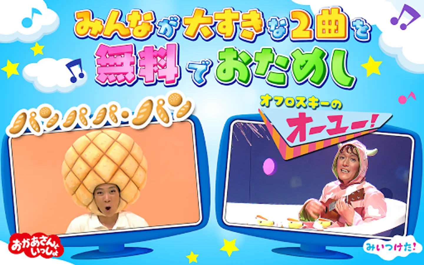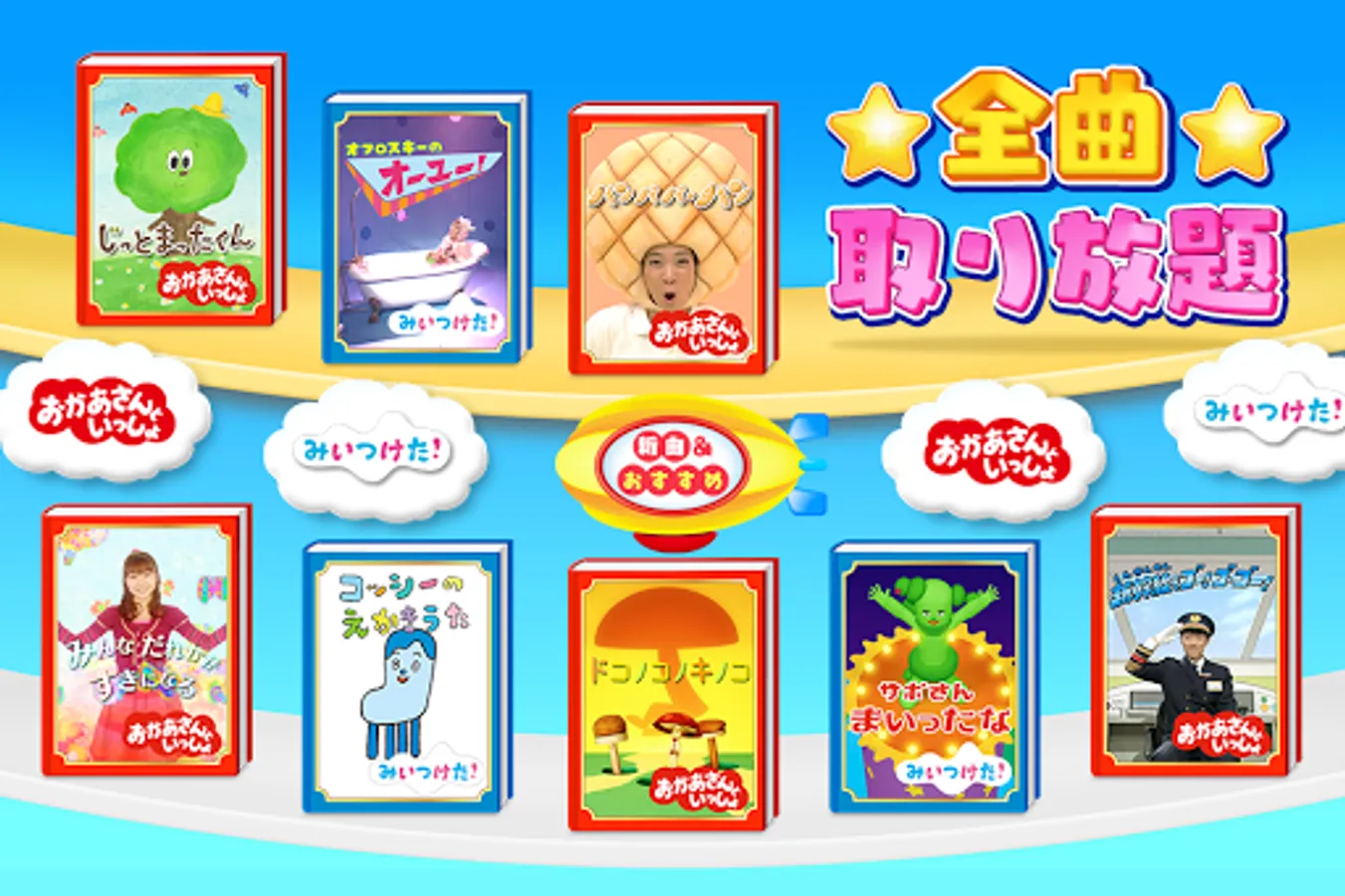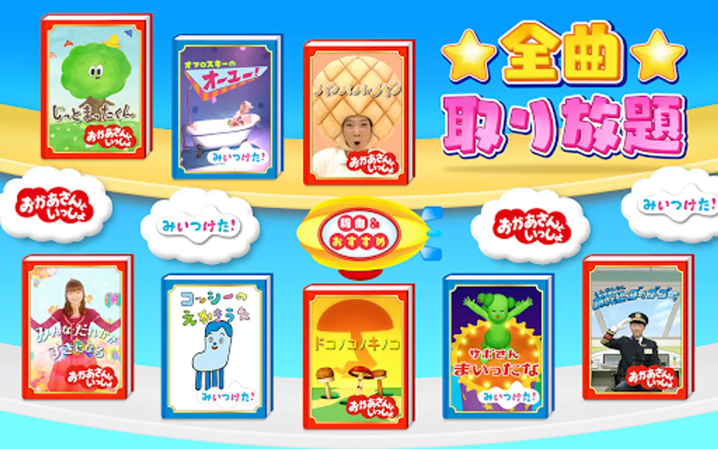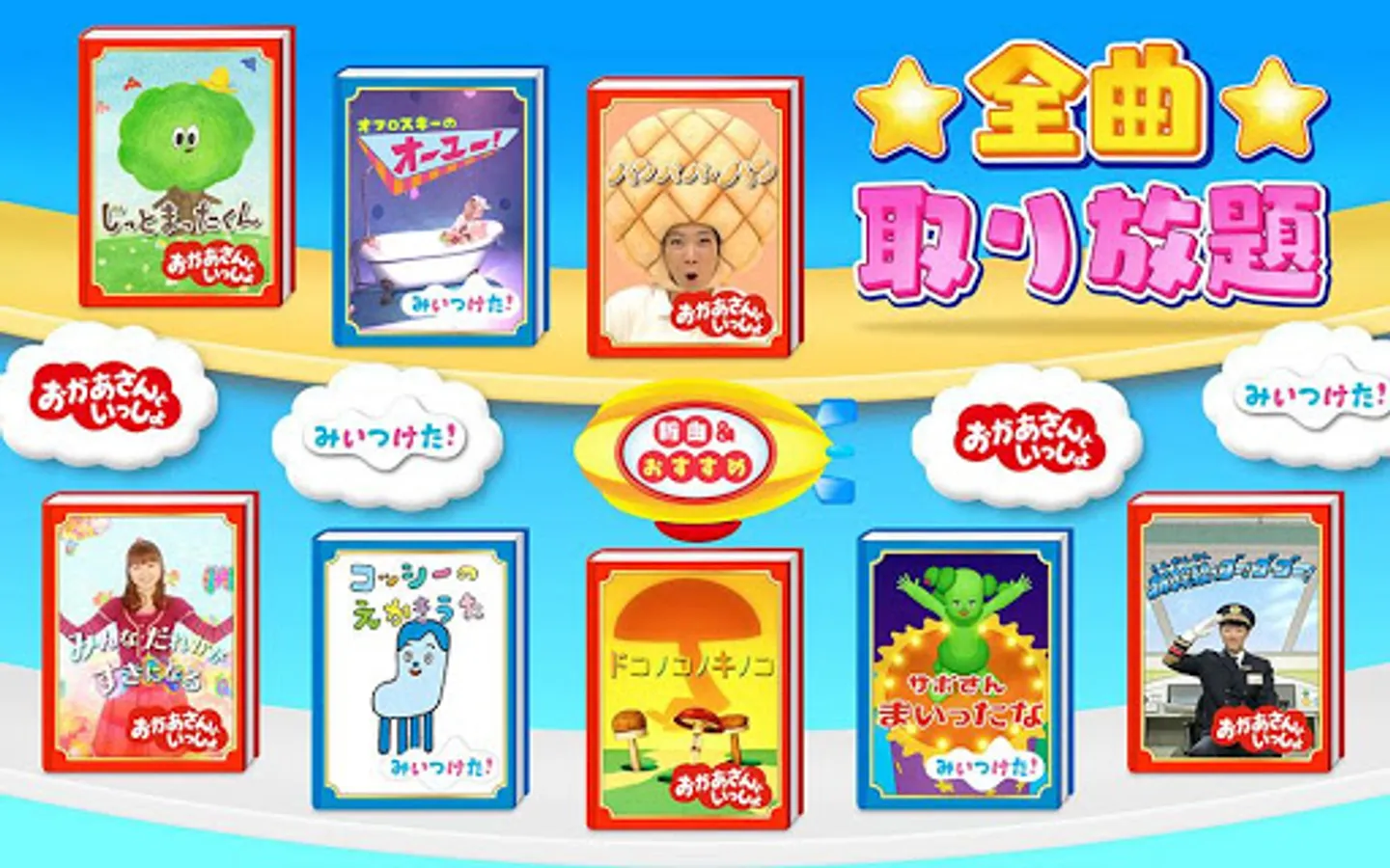In addition, many original songs from the popular programs "Okasan to Issho" and "Miitsuketa!" are distributed from babies to children. On the screen, familiar characters from the program, "Uta no Older Sister", "Uta no Oniisan", "Cossy", and "Sabo-san" will appear. Many snapshots are used for one song, and you can enjoy the app like a picture book.