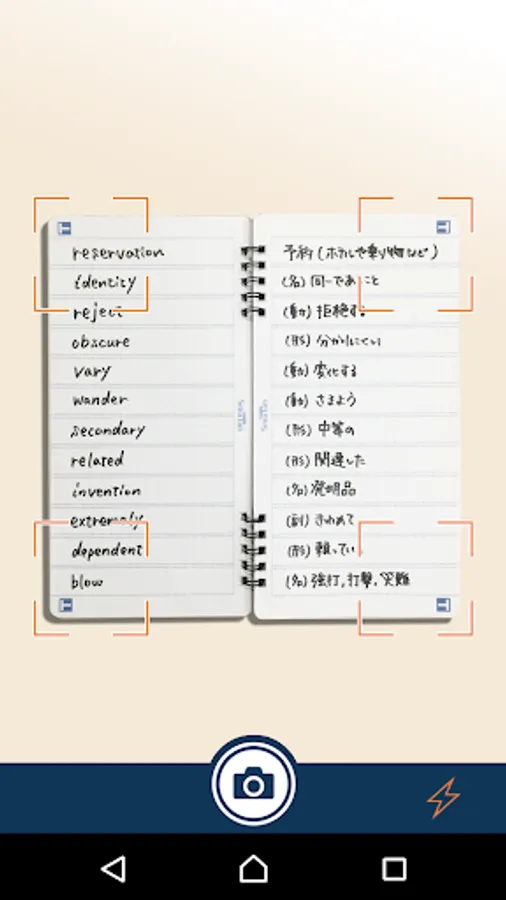 専用ノート「スマ単」の左ページに英単語、右ページに日本語という風に対になるように書き込みます。ページを見開きで撮影するとワンショットで12枚のカードをつくることができます。