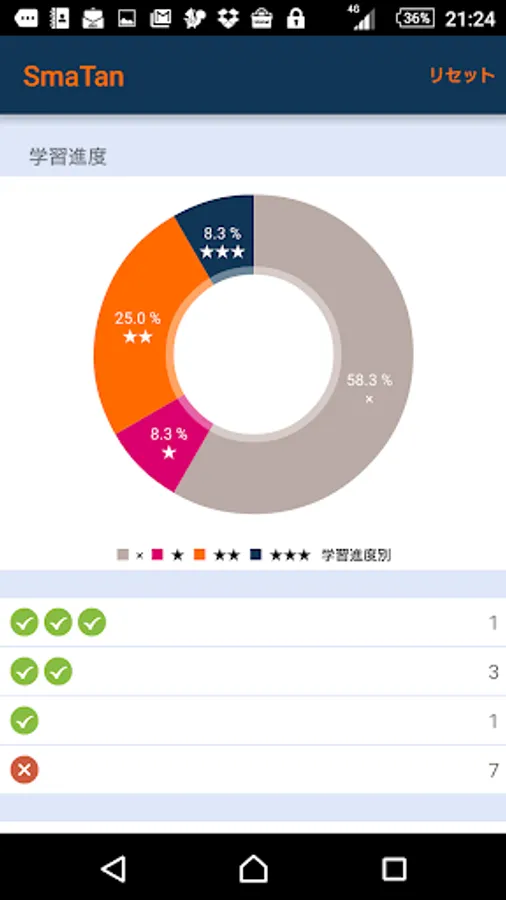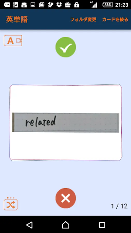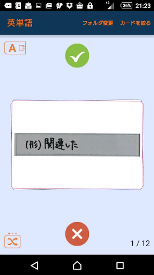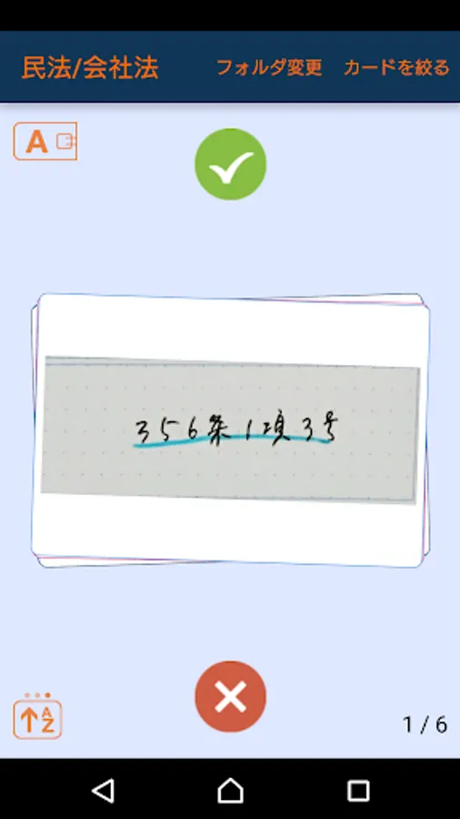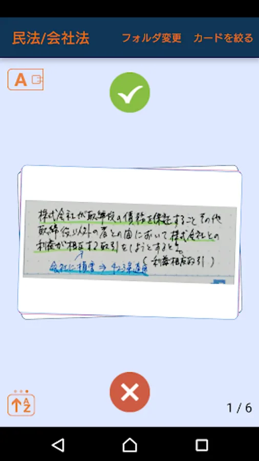 画面をタップすると画面が回転し、答えが見えます。暗記したら緑のボタン、まちがえたら赤のボタンで分類しておくと、苦手なカードだけを繰り返し反復して学習できるので、効率的で、かしこく、楽しく、暗記できます。