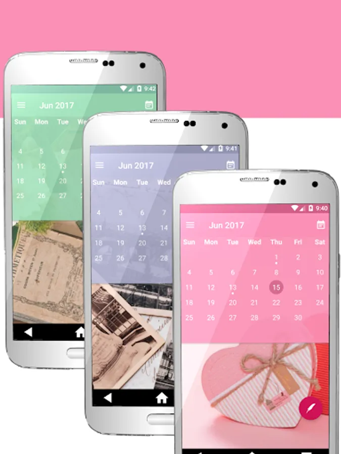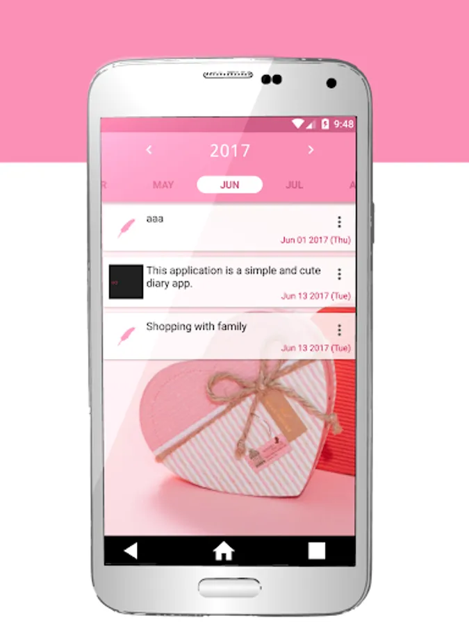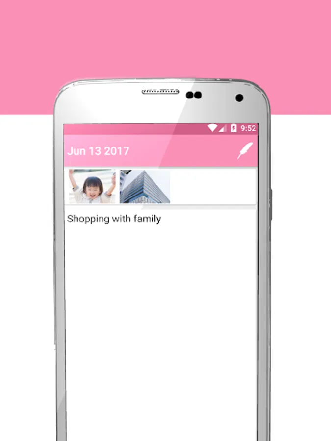 Select a date from the calendar and touch the round button on the bottom right. Write a diary and save with a check button.
