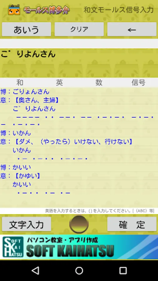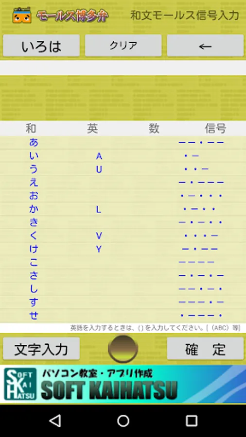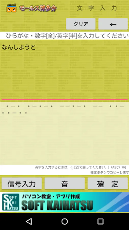 • In the text input screen, and converts it to Morse code by entering the hiragana and alphabetic characters, digits,