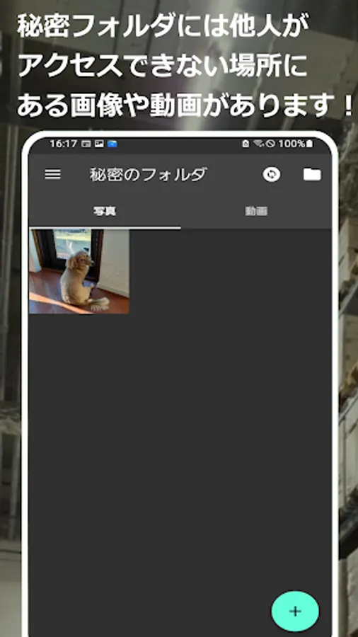 Secret photos and videos are managed for each folder. The folder has a photo tab and a video tab, and you can see the photos and videos in a list.
